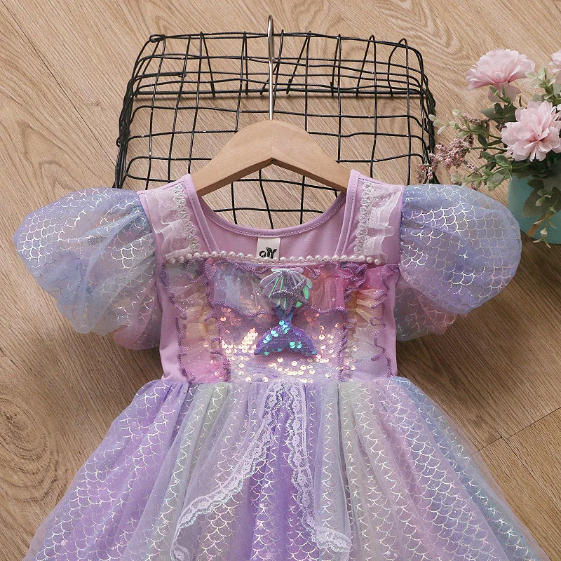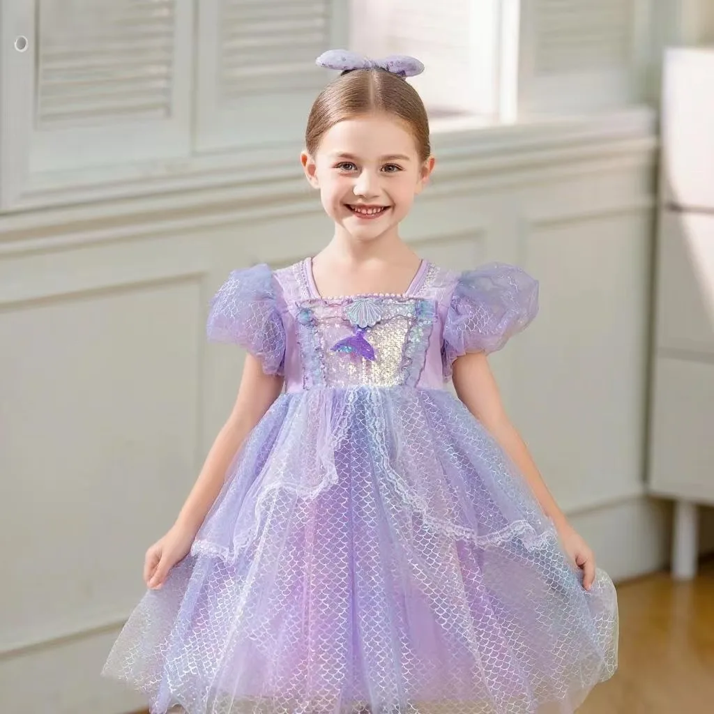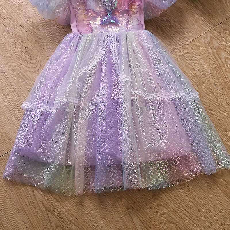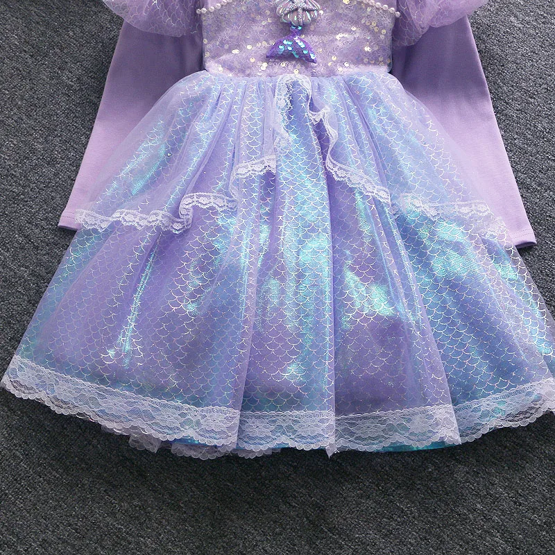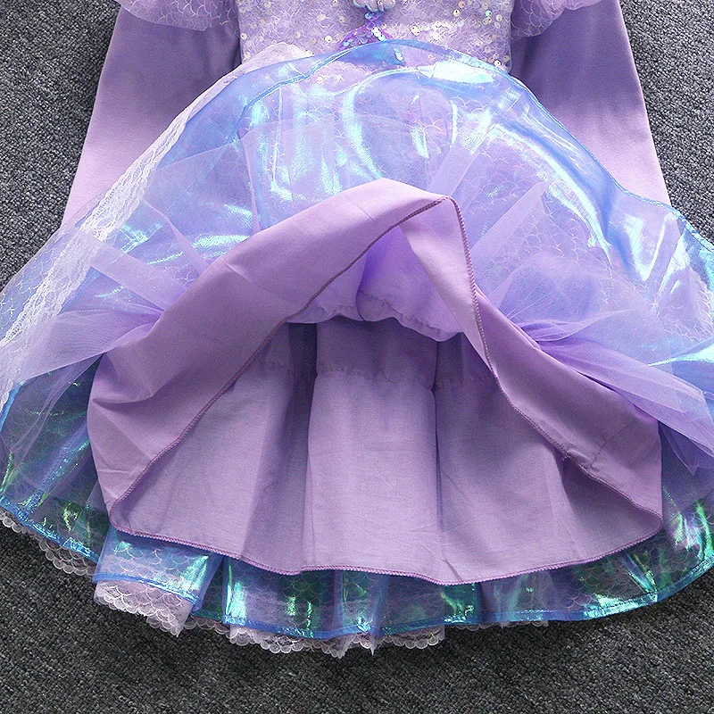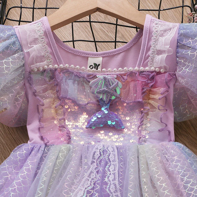 Enchanting Mermaid Design – Beautiful purple gradient tulle skirt with white lace trim creates a magical underwater effect, perfectly complemented by a delicate mermaid shell accessory on the bodice.