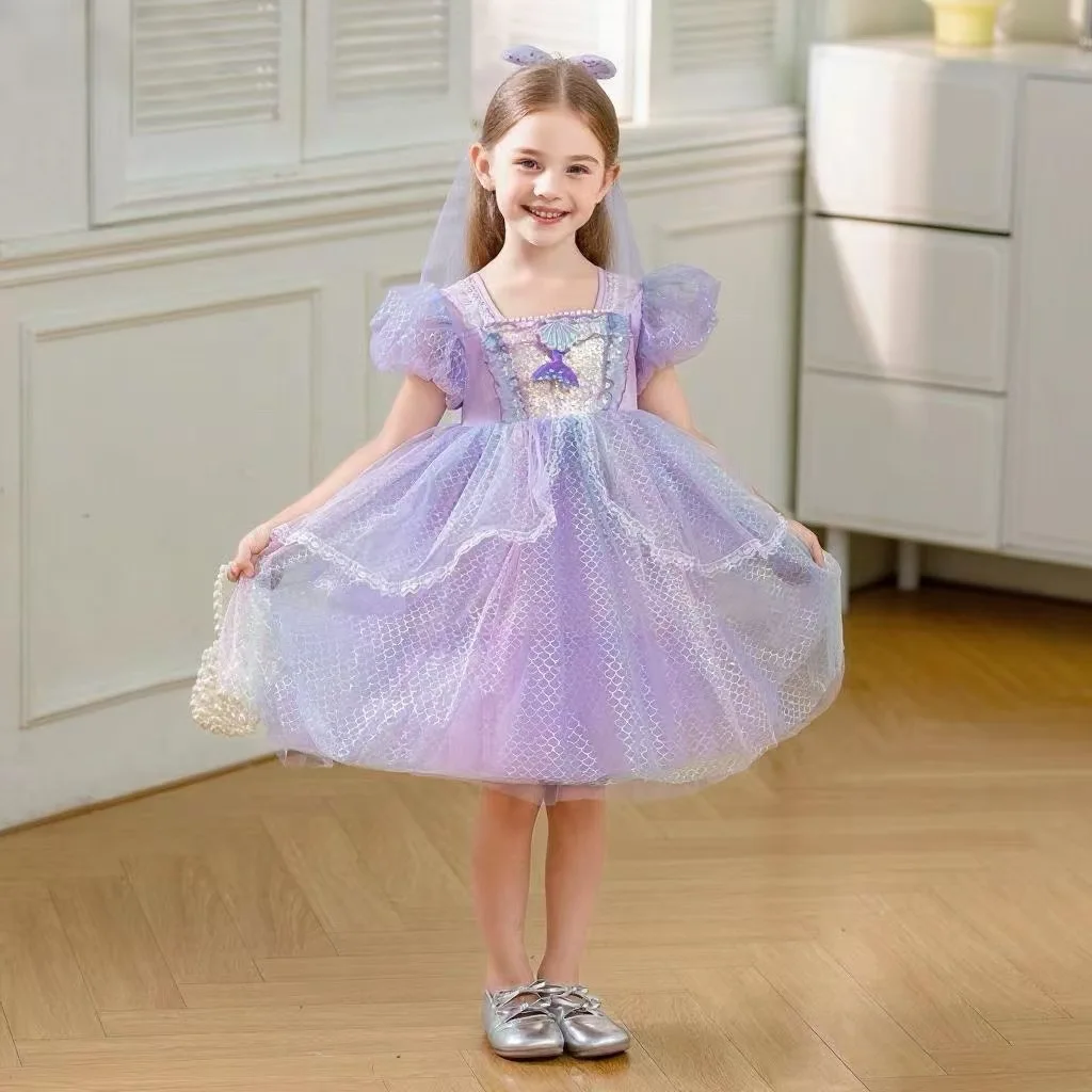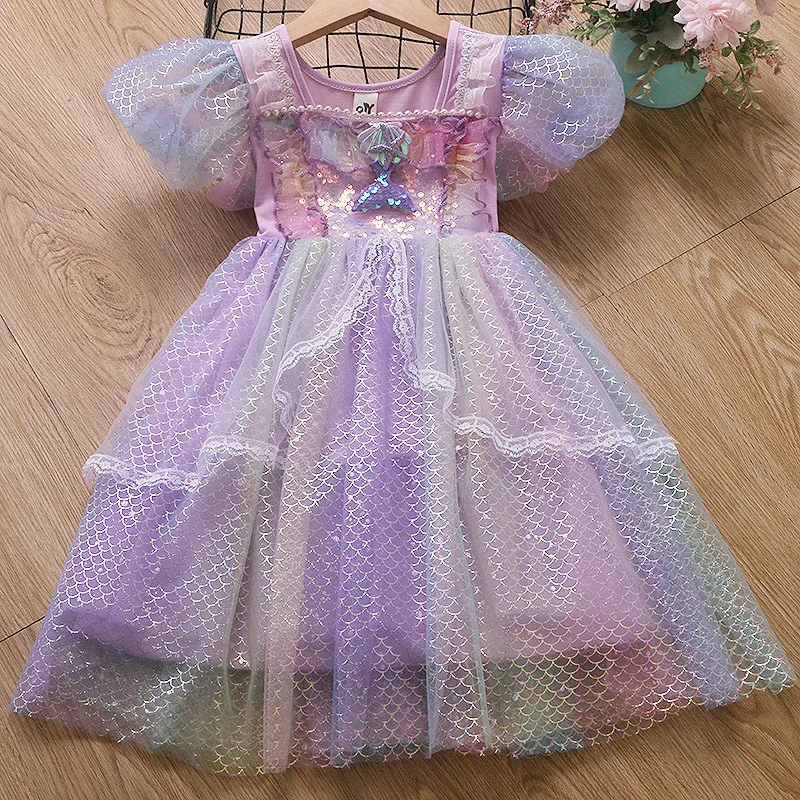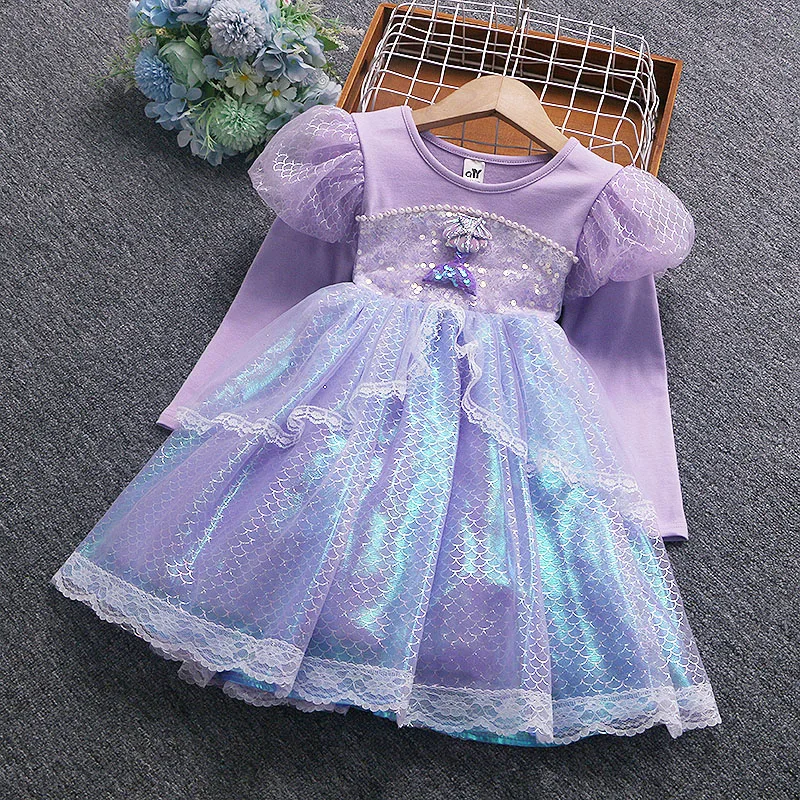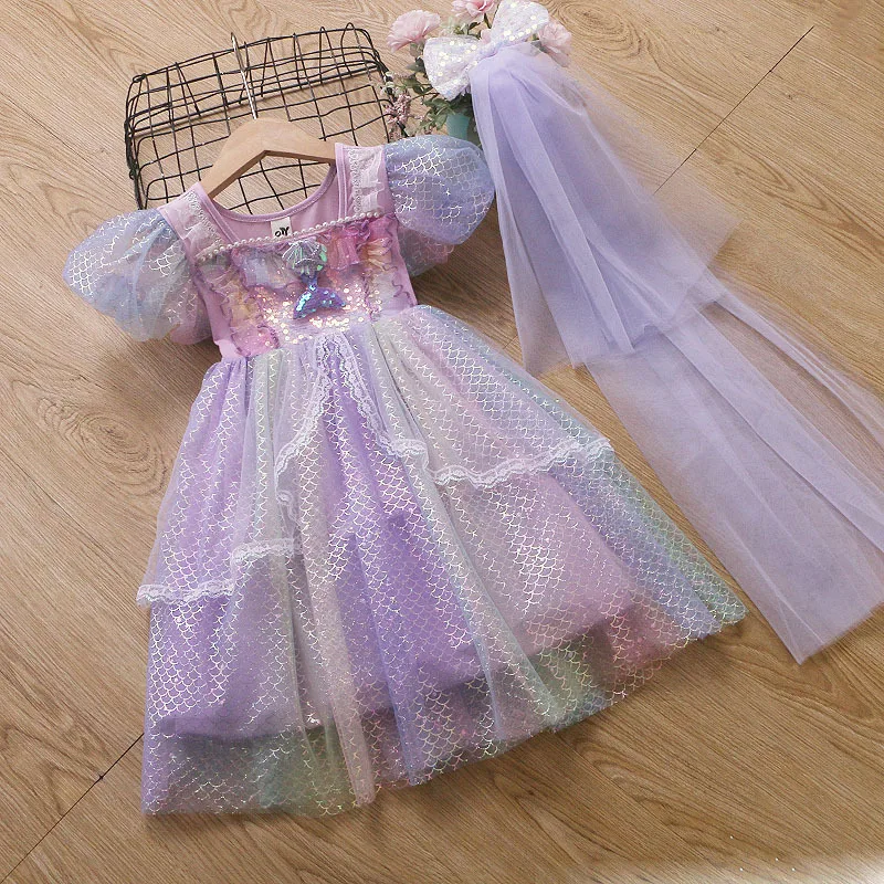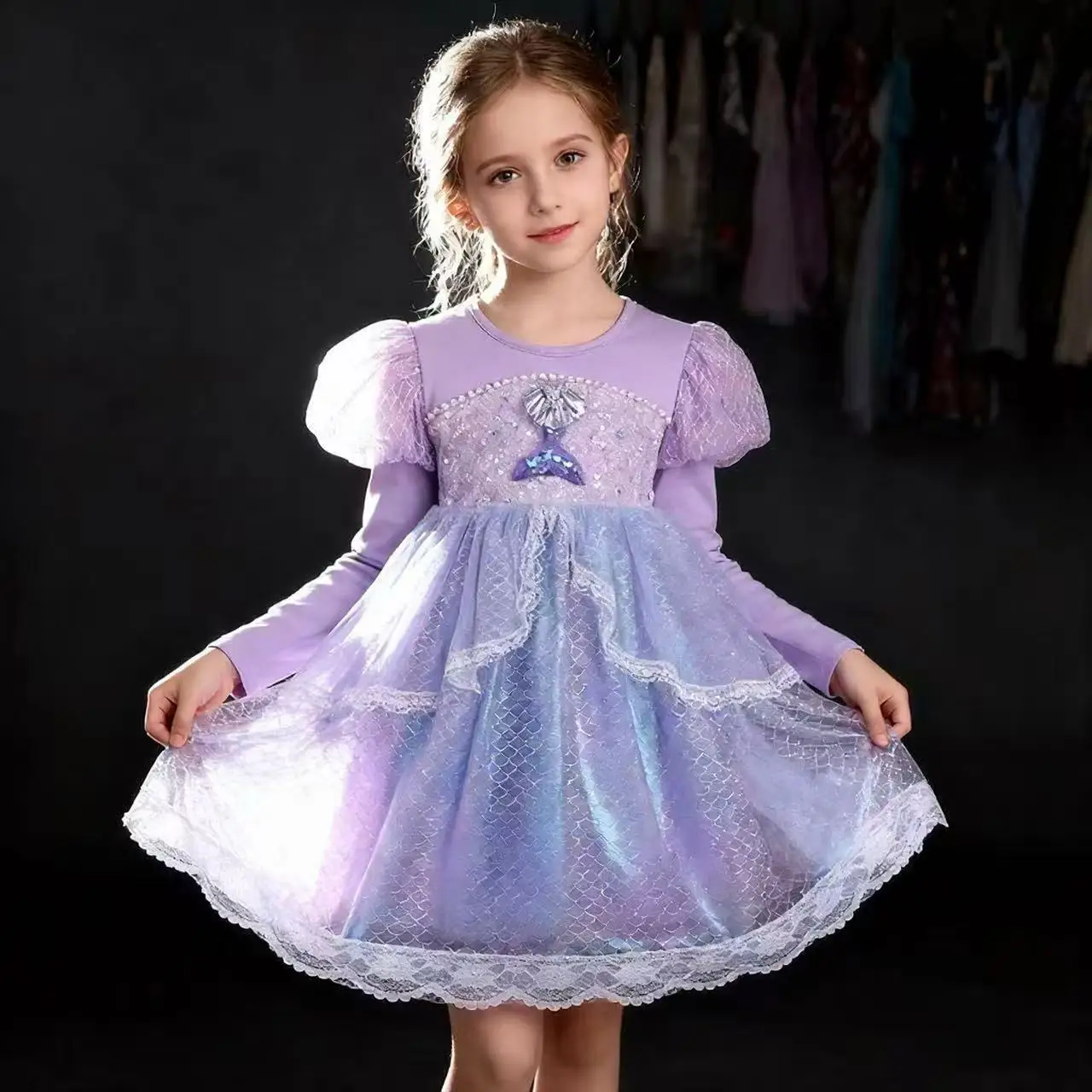 Enchanting Mermaid Design – Beautiful purple gradient tulle skirt with white lace trim creates a magical underwater effect, perfectly complemented by a delicate mermaid shell accessory on the bodice.