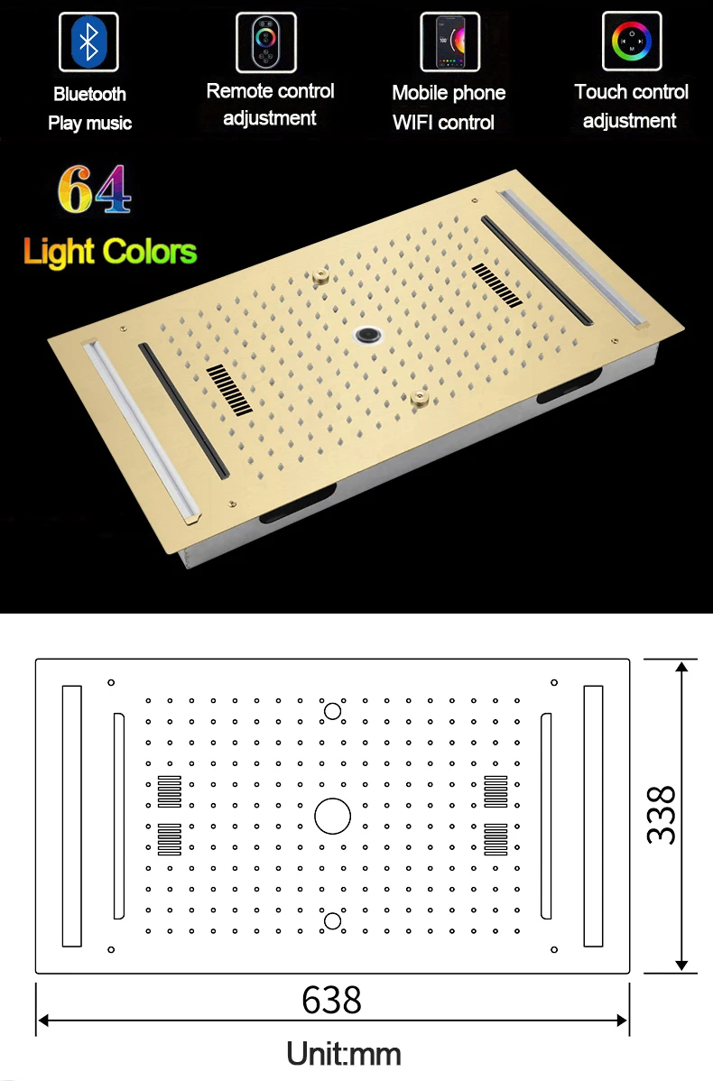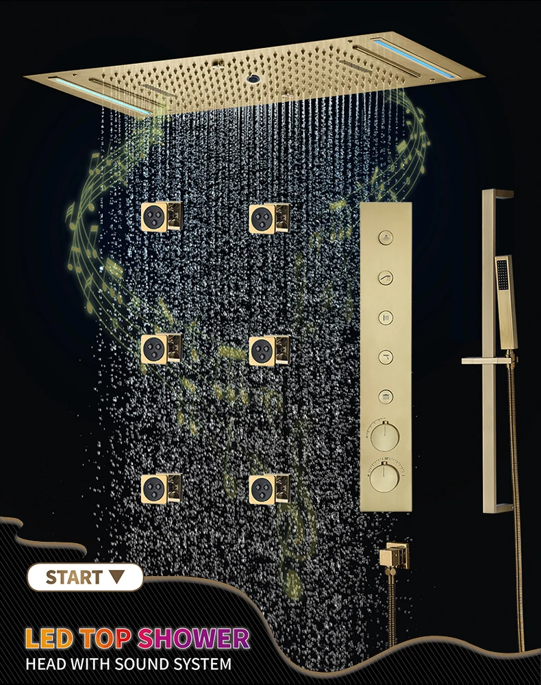 Qlonn 638*338mm Smart Music LED Shower Head Golden Shower System Bathroom Faucet Multi Functions Push Button Thermostatic Mixer