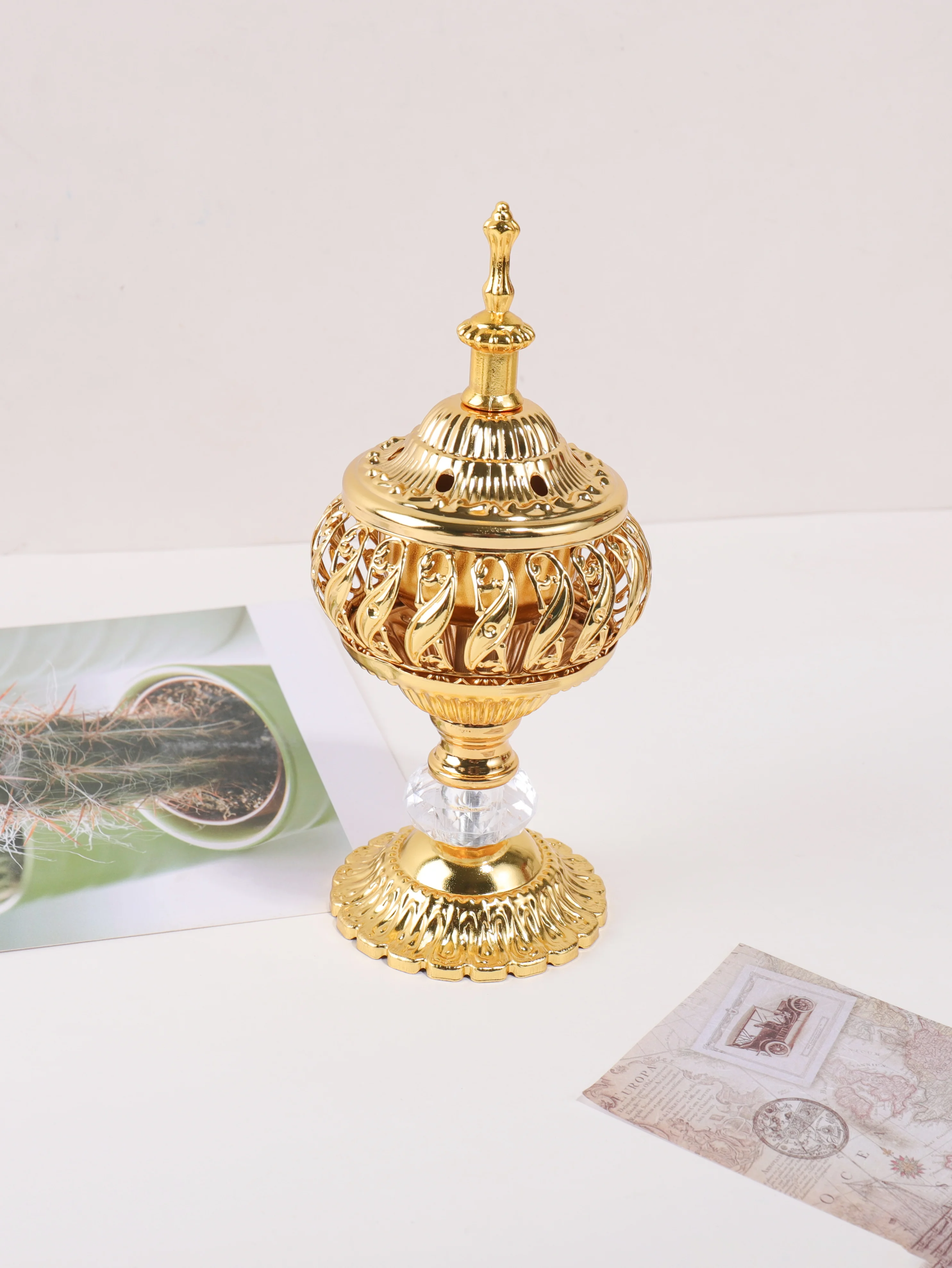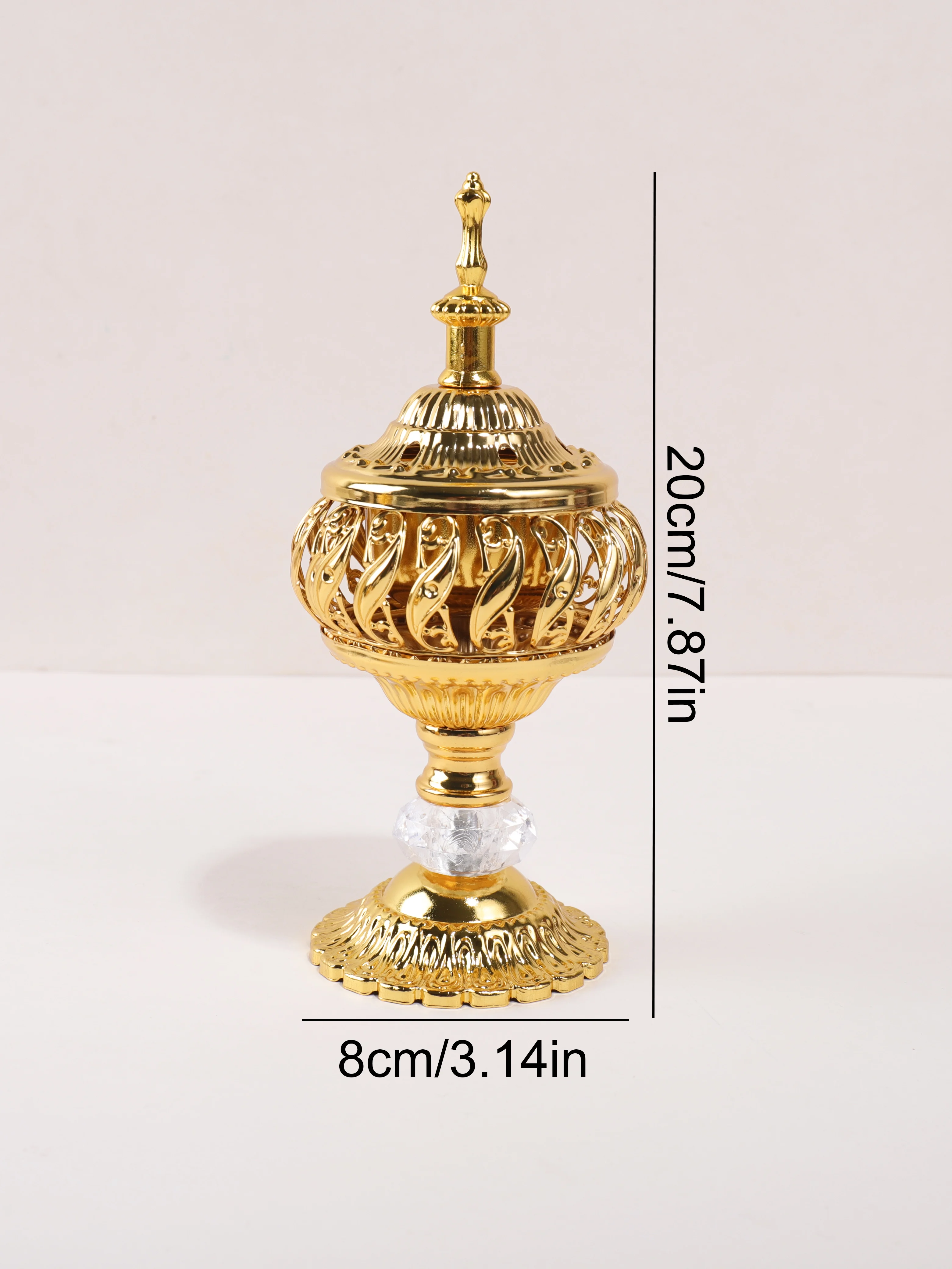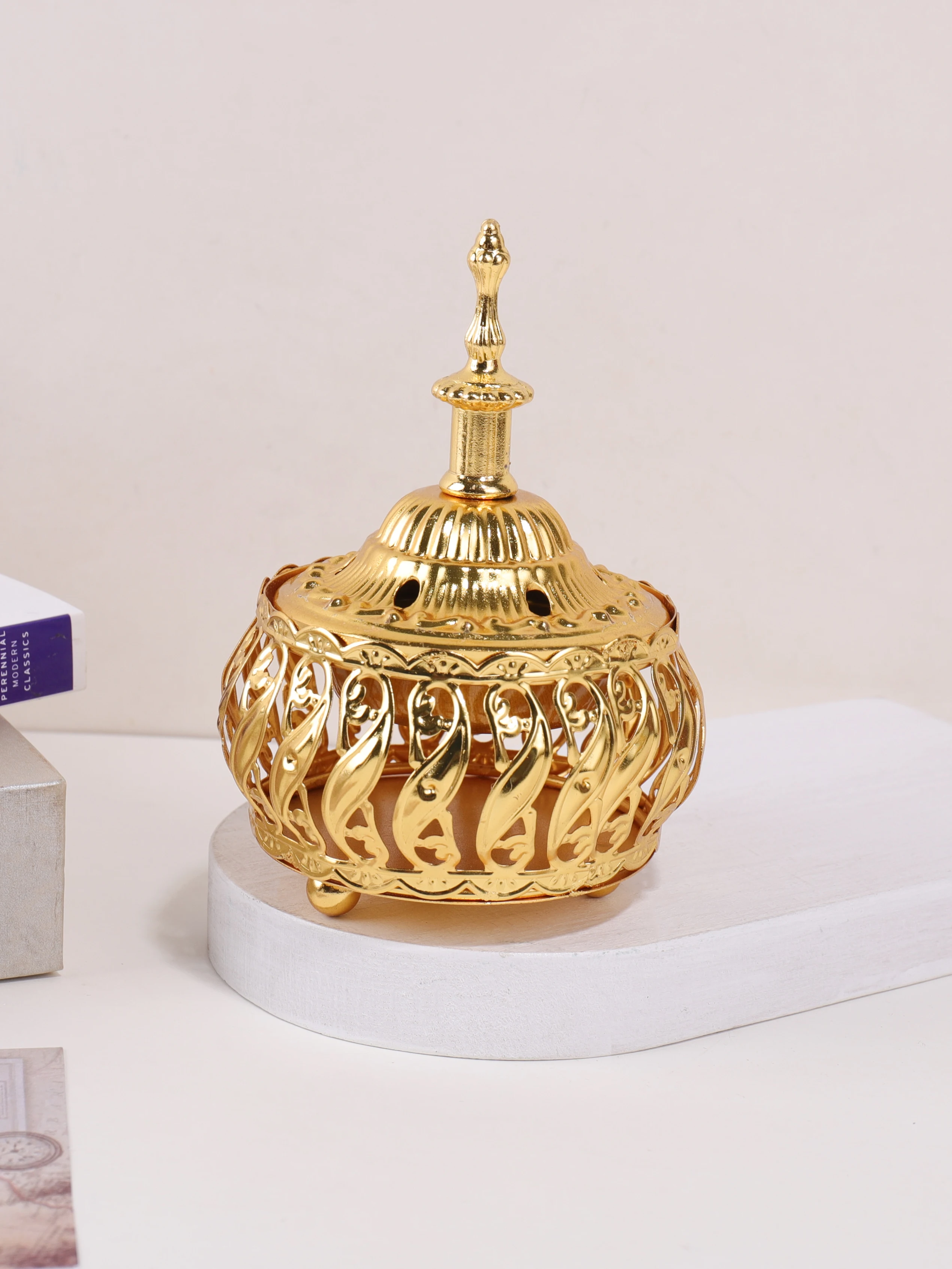 The Ramadan golden hollow incense burner features a pagoda-style design, adding a touch of elegance to any desktop.