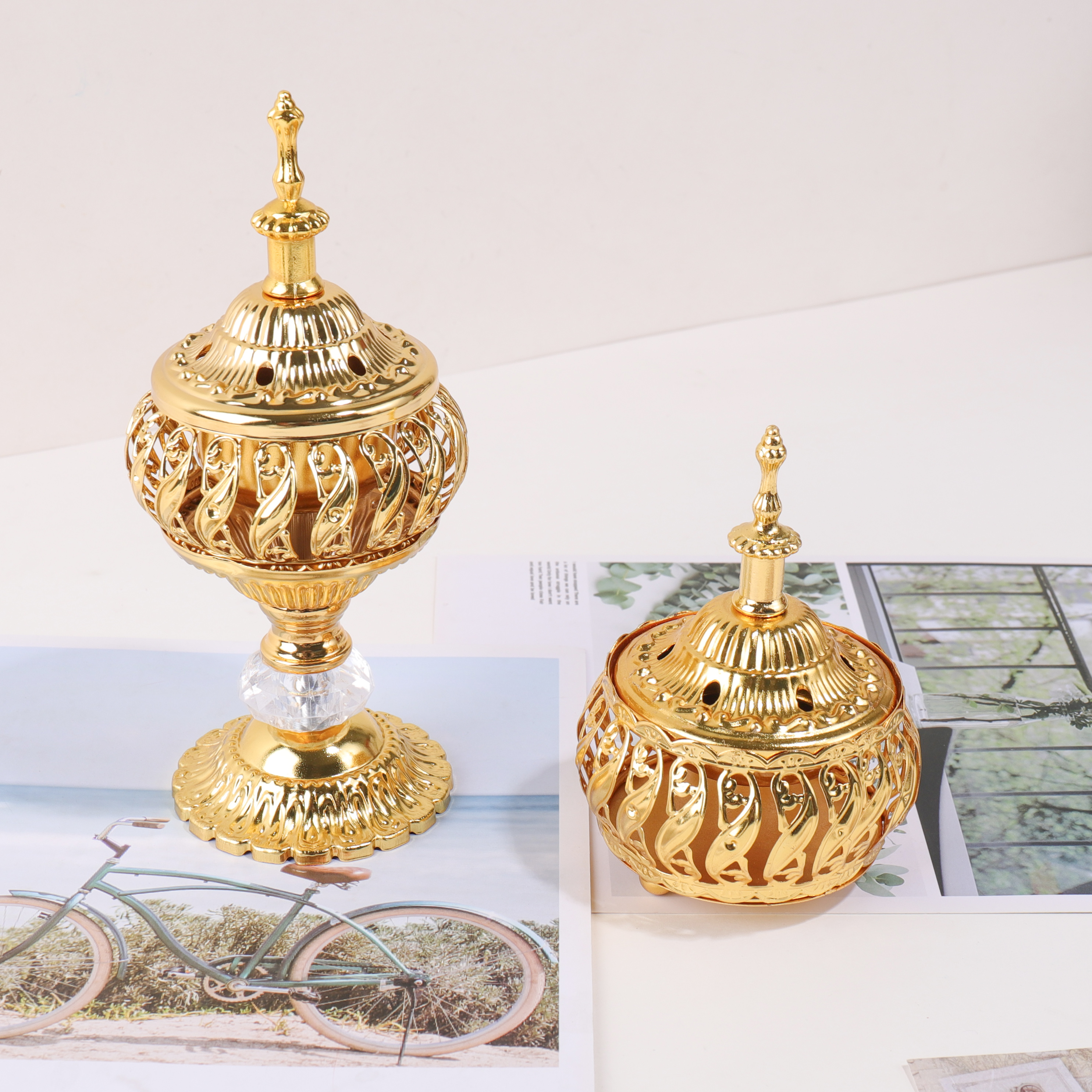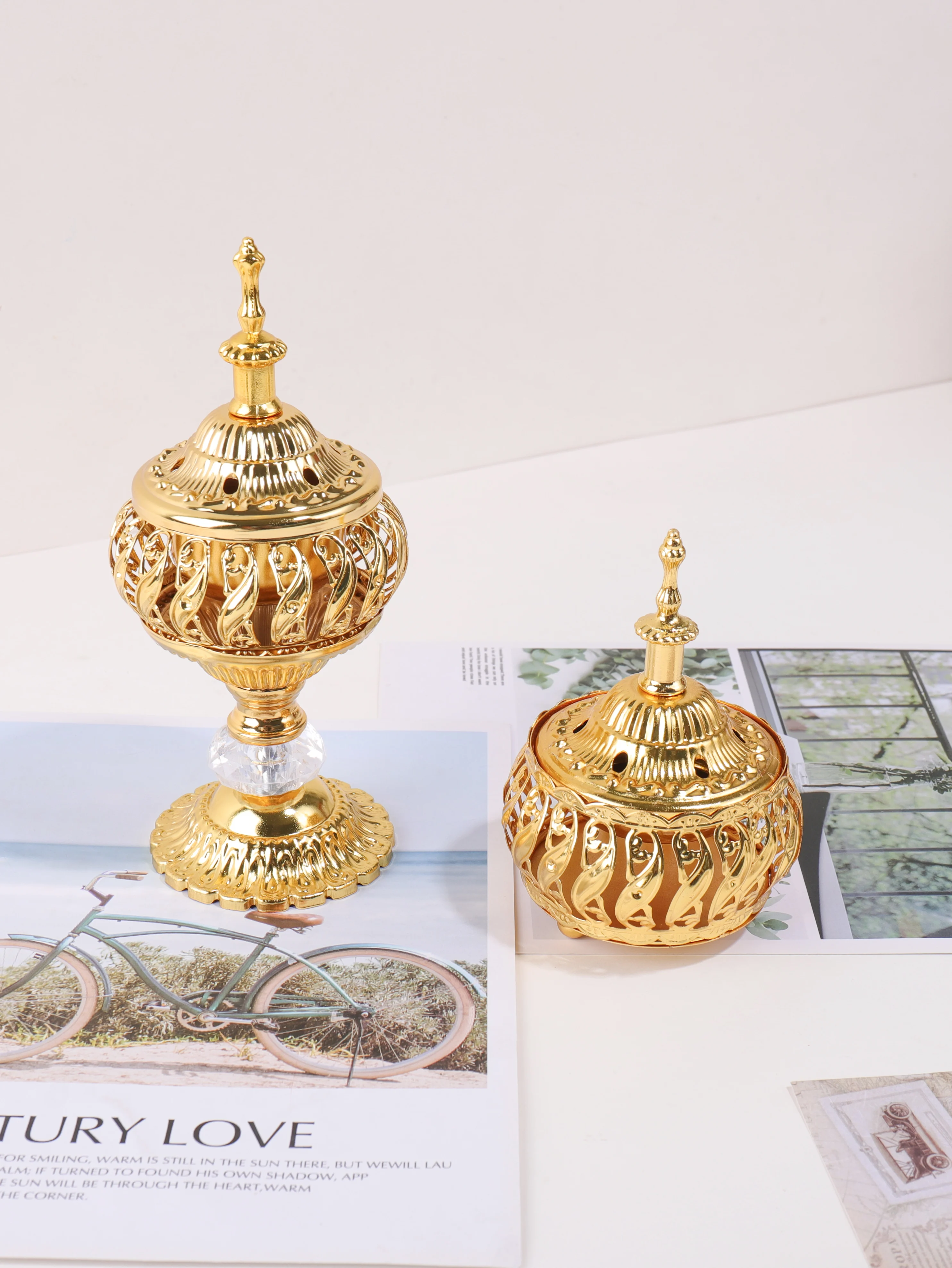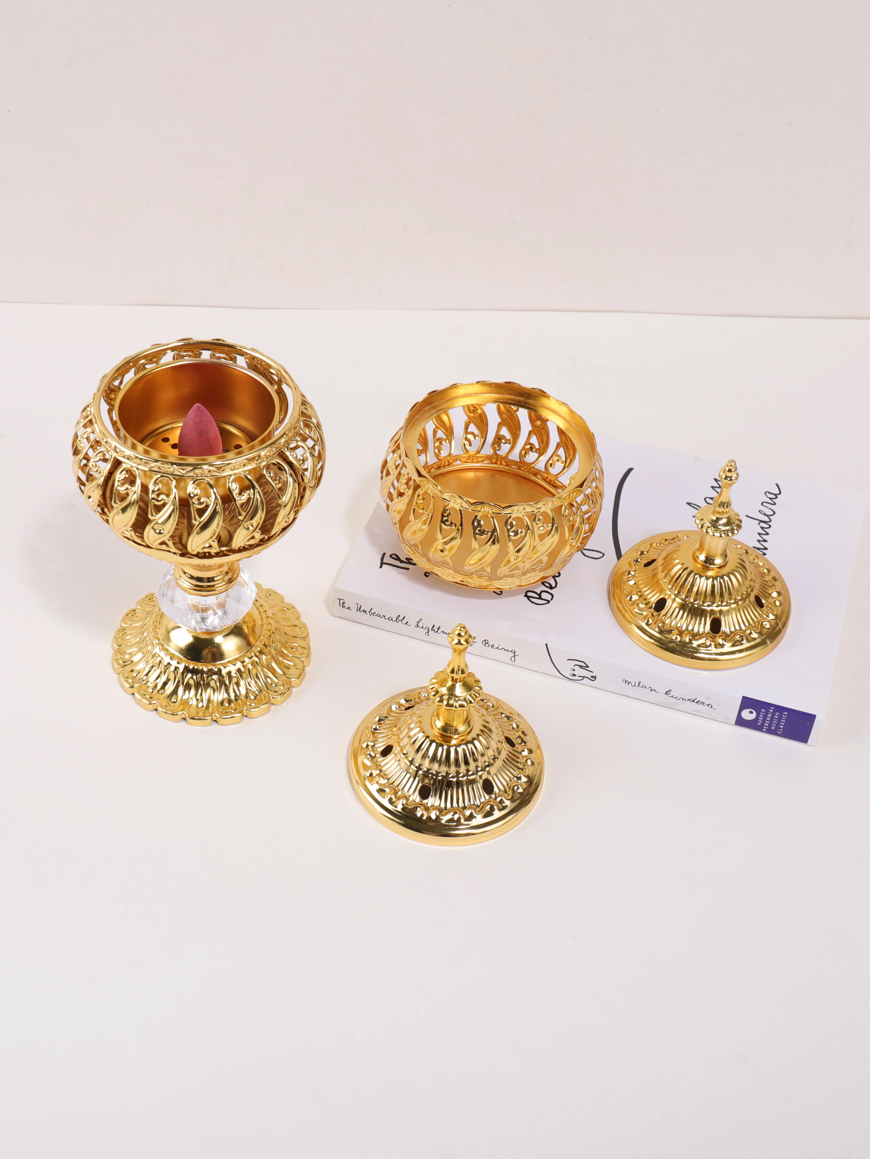 The Ramadan golden hollow incense burner features a pagoda-style design, adding a touch of elegance to any desktop.