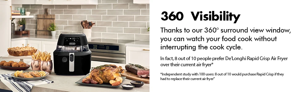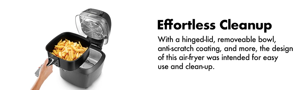 The new Rapid Crisp Air Fryer from De’Longhi is remarkably efficient, cooking food up to 20% faster than leading competitors. Rapid Crisp takes a clean approach to create great tasting, quality food: cooking up meals that are crunchy and delicious-with little to no added oil. By optimizing duo heat technology, this model quickly prepares up to 5 quarts of food for your family. Cook an entire chicken with vegetables, a mountain of crispy French fries, juicy pork chops, flaky salmon, even your best batch of chocolate chip cookies! With 4 power levels and 5 preset functions (Potatoes, Pizza, Roast, Bake, Manual), you can cook your favorites-and feel confident that you’re feeding your family in a healthier way. And with a 360° Surround View window, you can watch your food as it crisps, to attain the perfect bite-without interrupting the cook cycle. Rapid Crisp is the perfect way to craft a crispy, delicious meal that everyone can enjoy-without hours spent preparing, cooking, and cleaning. And with a hinged lid and a lightweight, removable bowl, cleanup is effortless, too.
