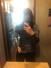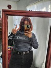 It is size M and for women can fit someone size M-G It stretches a lot and fits very well to the body I already want it to be Halloween to use as part of the costume❤️ Quite satisfied