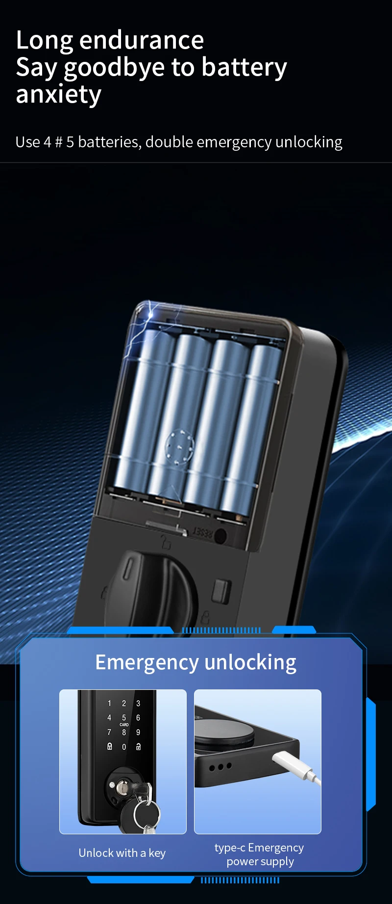 Mechanical keys and emergency power supply (Type-C) can be used when the door lock is out of power.