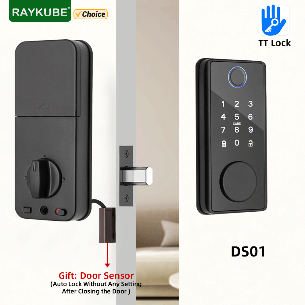 RAYKUBE DS01 BLE TT Lock Smart Fingerprint Deadbolt Lock with Latch/Door Sensor Auto Lock Key/Password/Card/ TT Lock APP Unlock