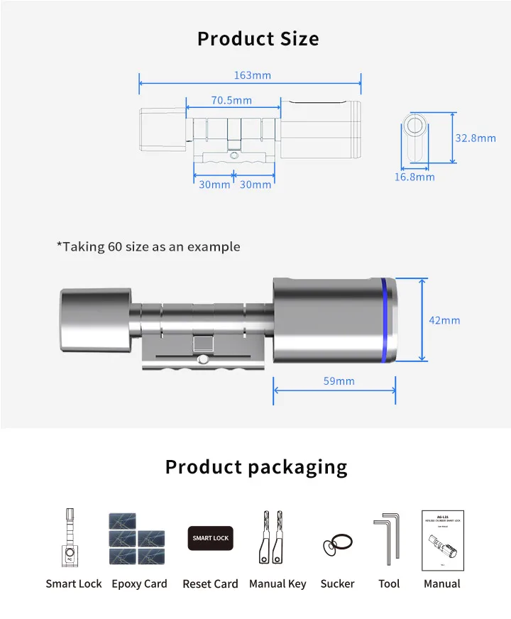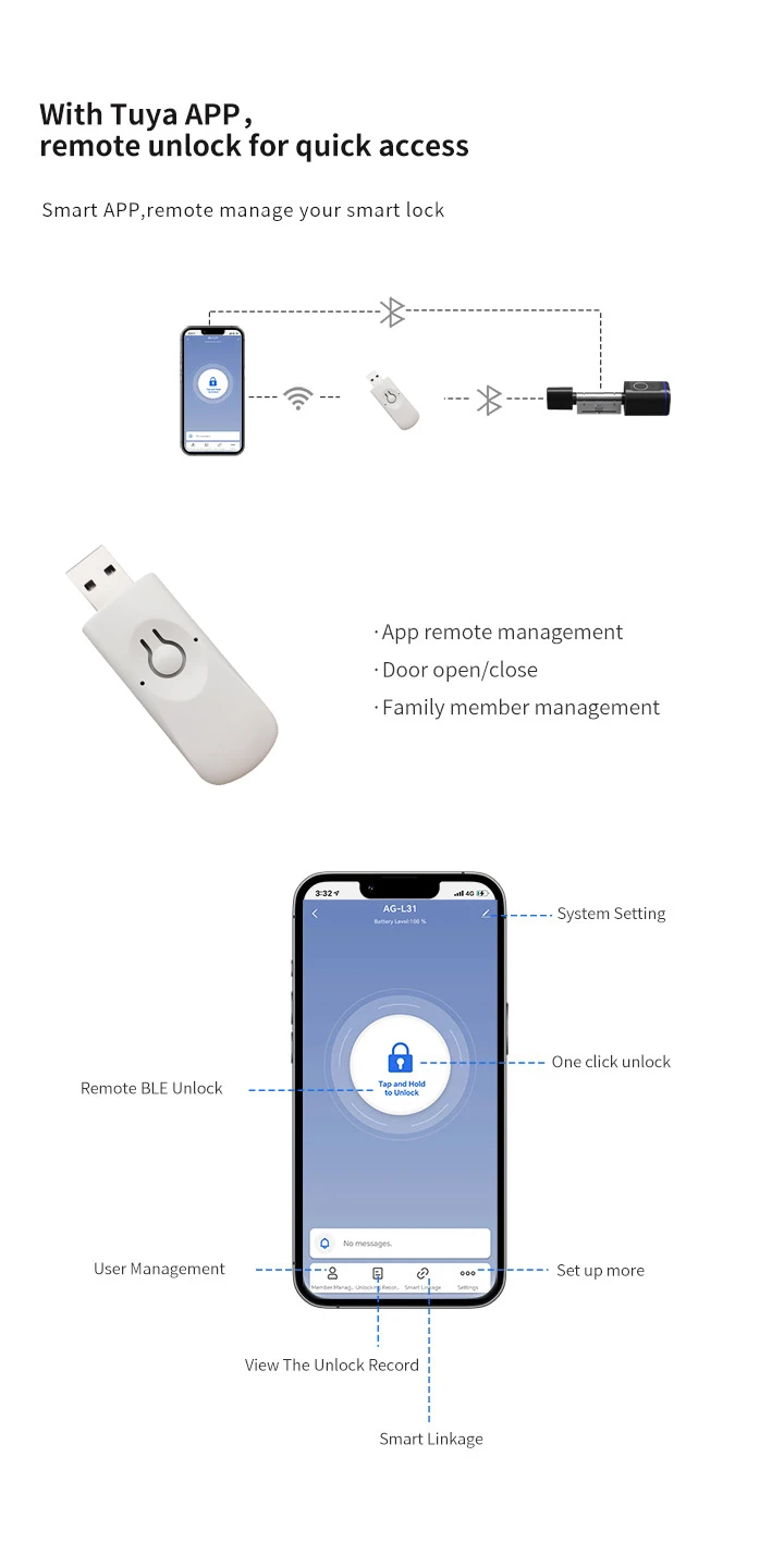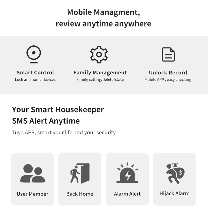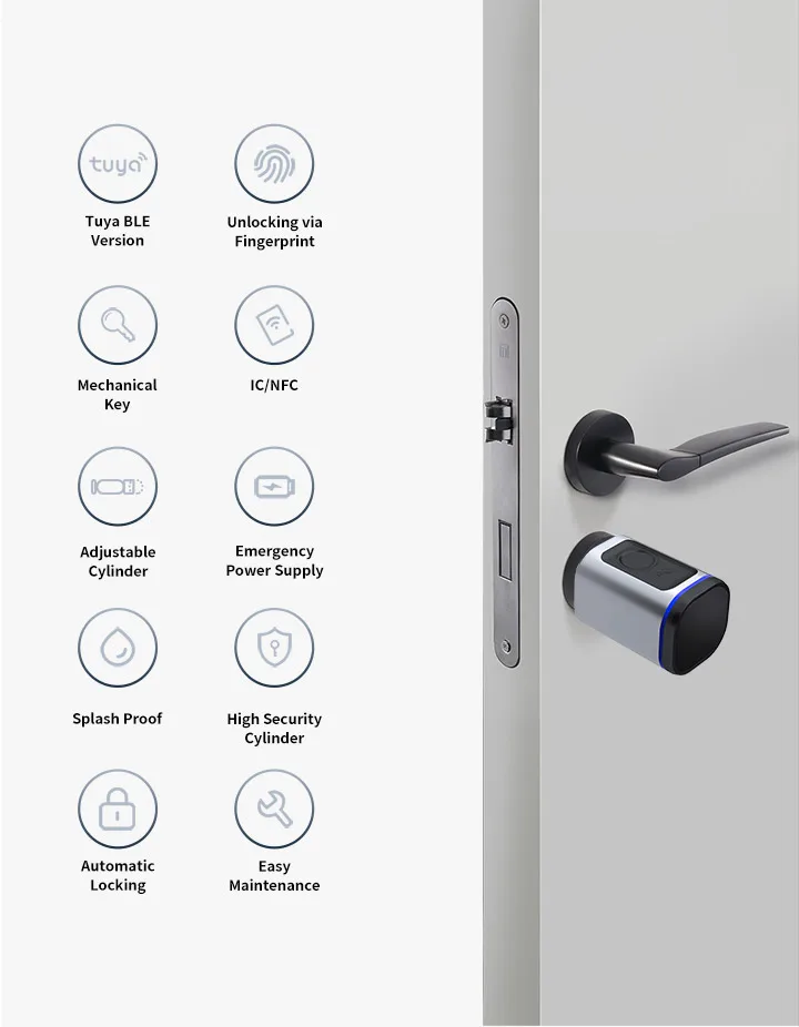(5 unlock methods): Tuya APP/ Fingerprint/ IC card/ Key