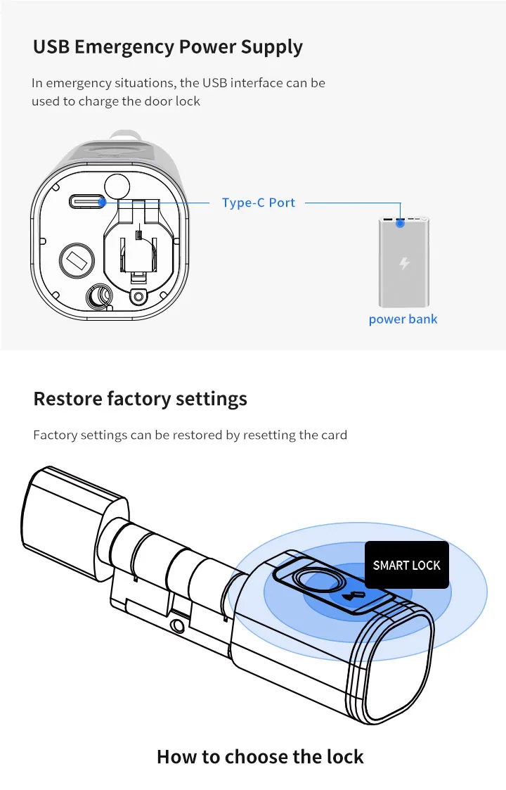 Mechanical keys and emergency power supply (Type-c) can be used when the door lock is out of power