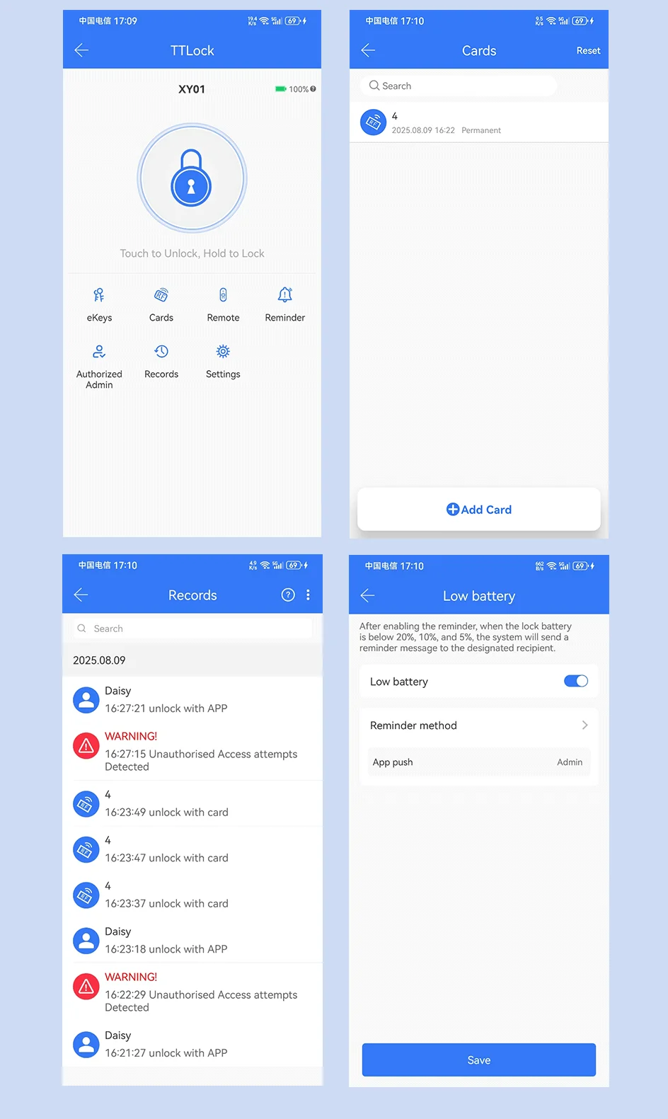 3.TT Unlock APP Contol, IC card can be added or delete from APP; Unlock records can be view on TT Lock APP