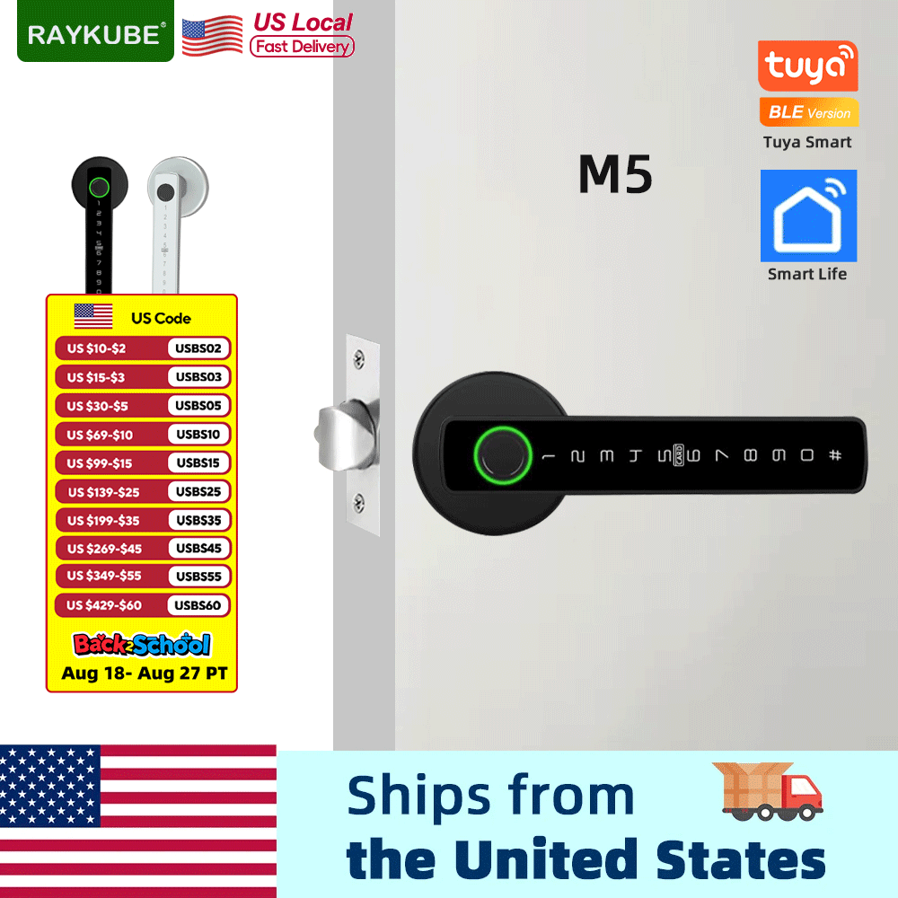 RAYKUBE M5 US Free Delivery Tuya BLE Smart Fingerprint Door Lock Electronic Lock with Password/Key/Card/Tuya APP Unlock
