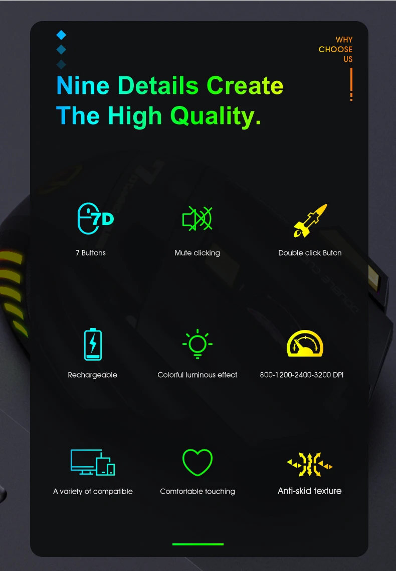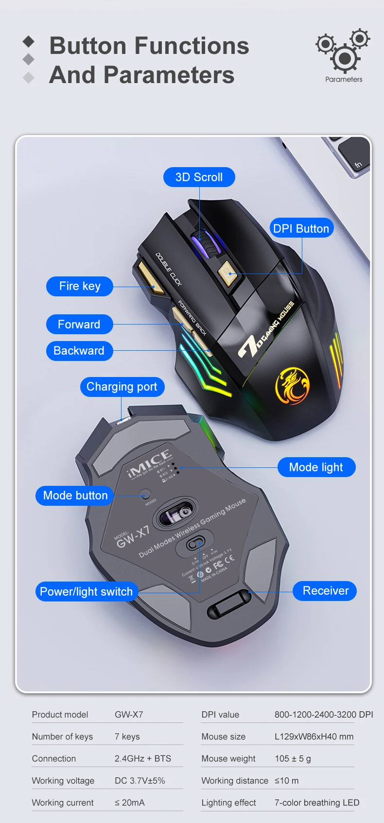 The product is identical to the image and description, the finishes are detailed, feel good material with a weight suitable to be a mouse, both USB and BT mode work optimally. It is recommended to improve the packaging since the box arrived with dents, which do not affect the product but the aesthetics of the box