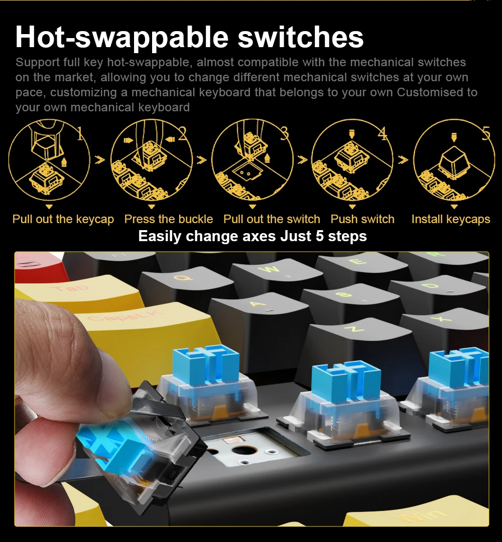 YES! TRUE HOT-SWAP – The transformative innovation with 99.8%+ switches compatible free-mod hot swappable Redragon keyboard is available now. The unique exclusive structure design of the socket makes the switch mounting easier and less wobbling.