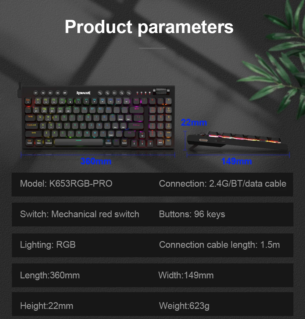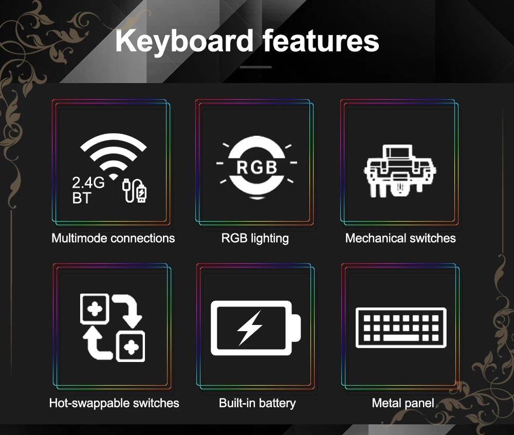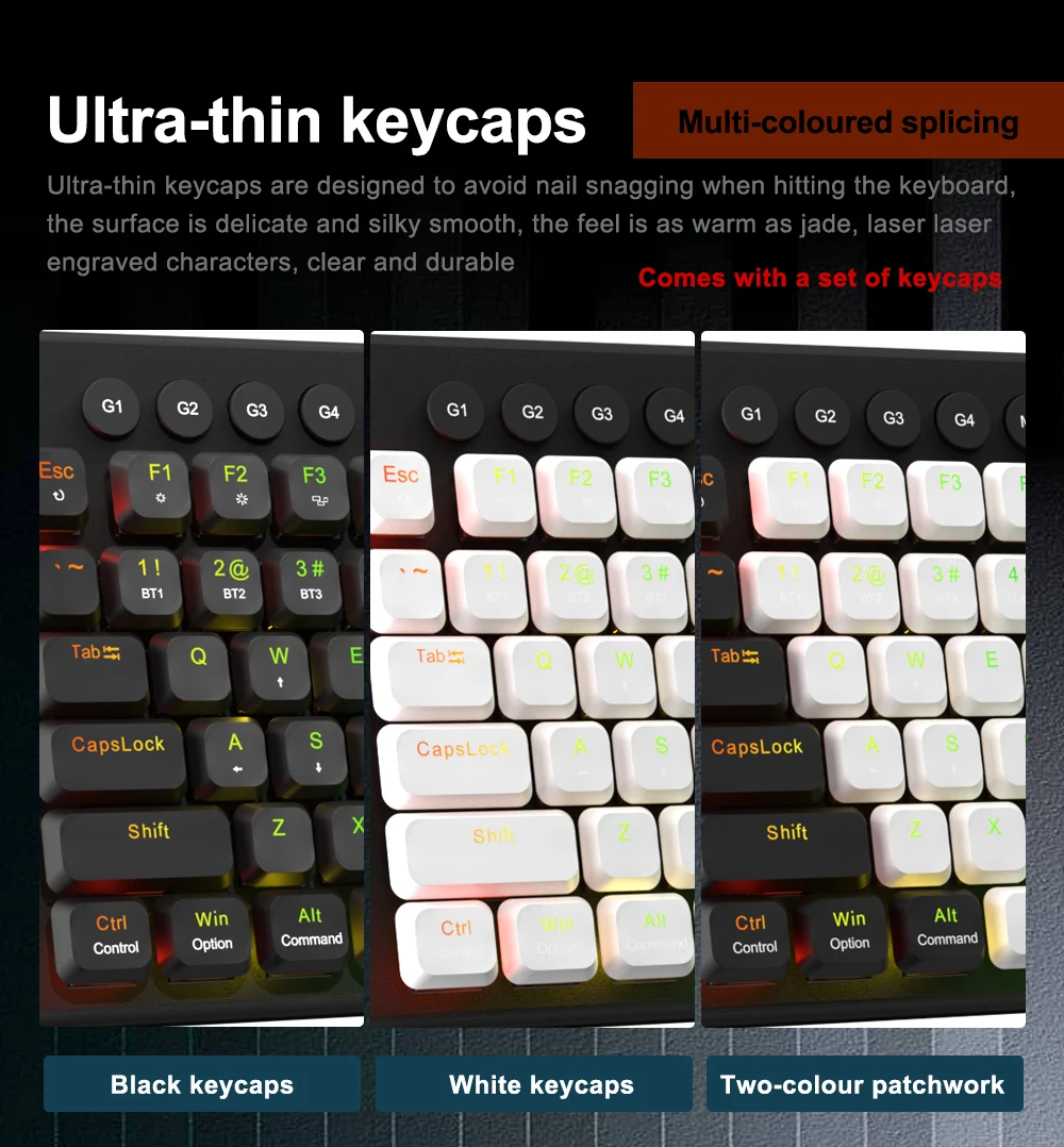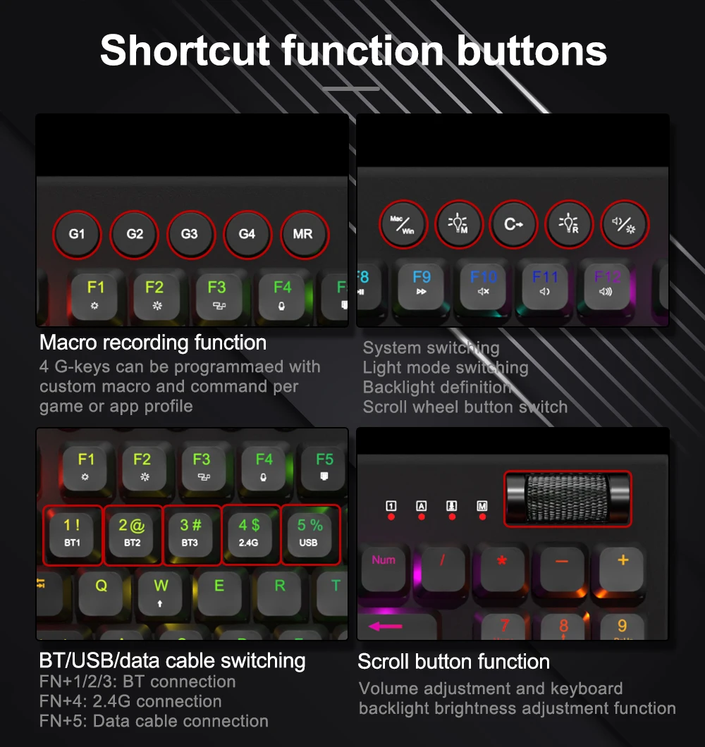 High quality mechanical switches,BT/2.4G/Wired connecting ,Low-profile switch,Detachable,Super slim keycaps,5 macro keys,5 multimedia keys.