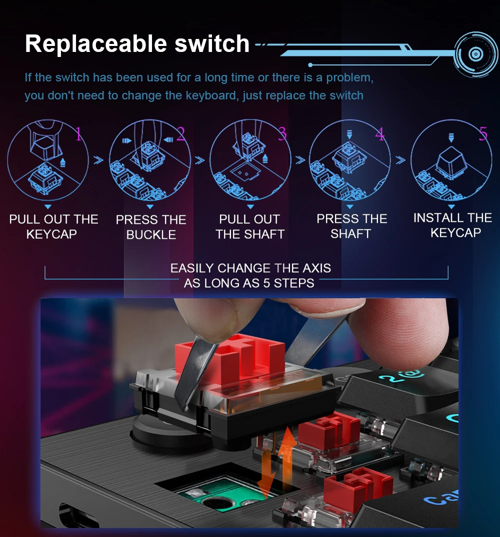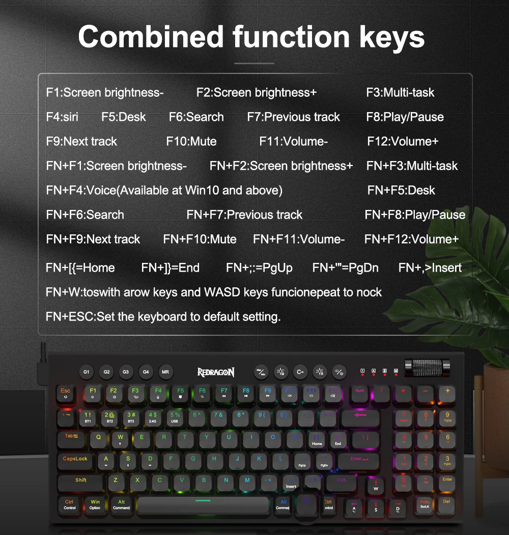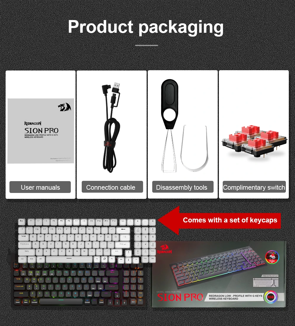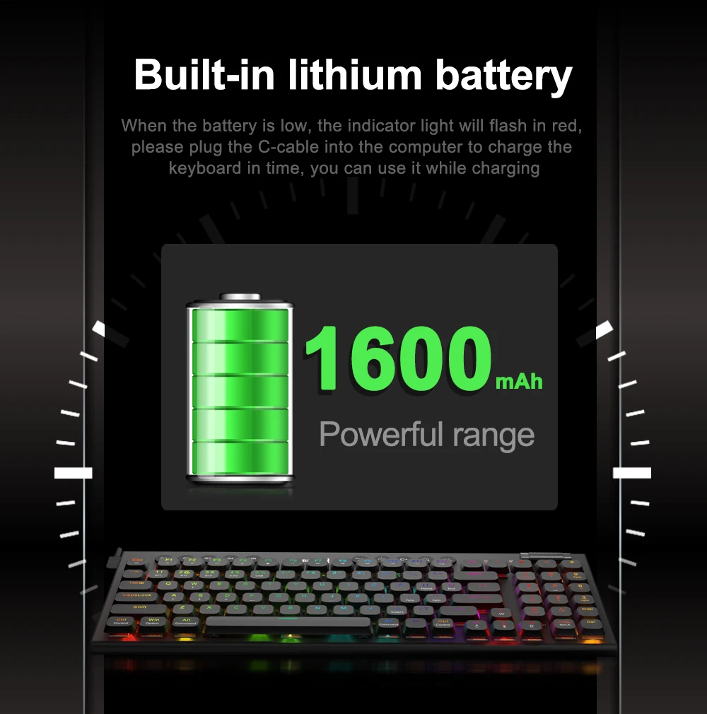 High quality mechanical switches,BT/2.4G/Wired connecting ,Low-profile switch,Detachable,Super slim keycaps,5 macro keys,5 multimedia keys.