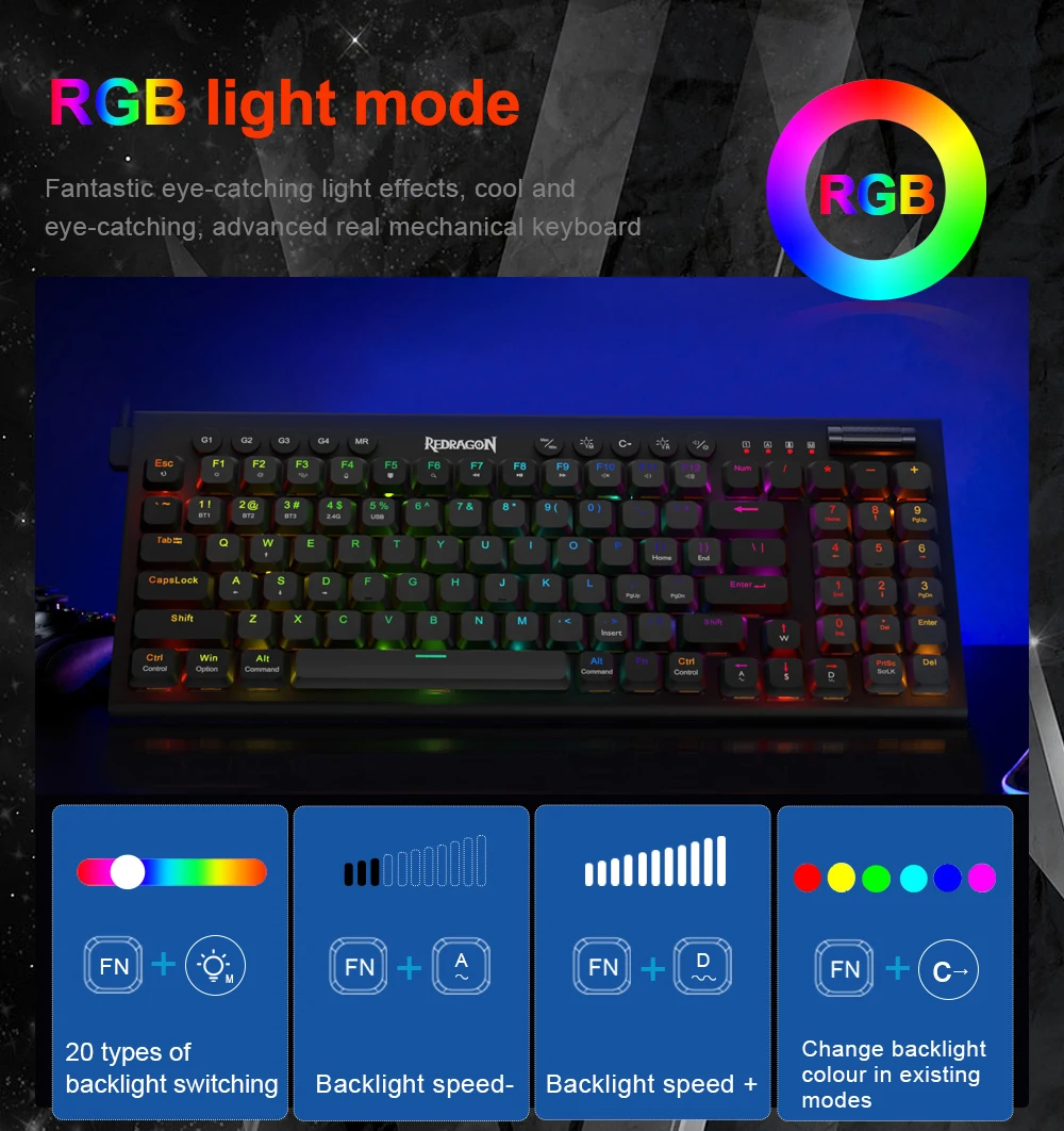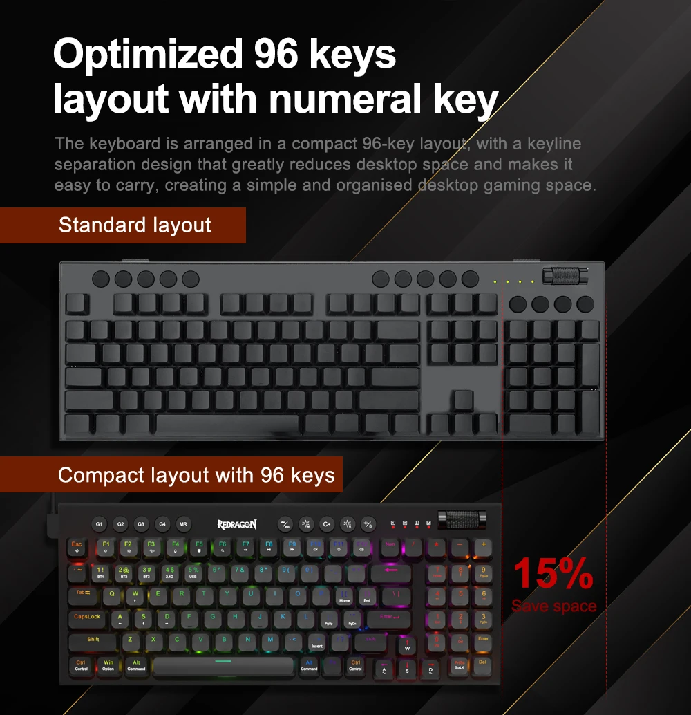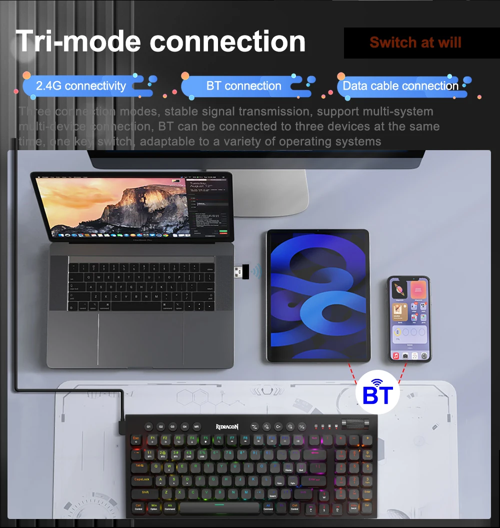 3-Mode Connection: Here comes Redragon innovative 1st-Gen 3-mode connection technology, USB-C wired, BT 3.0/5.0 & 2.4Ghz wireless modes which advanced your use experience to next level in all fields.