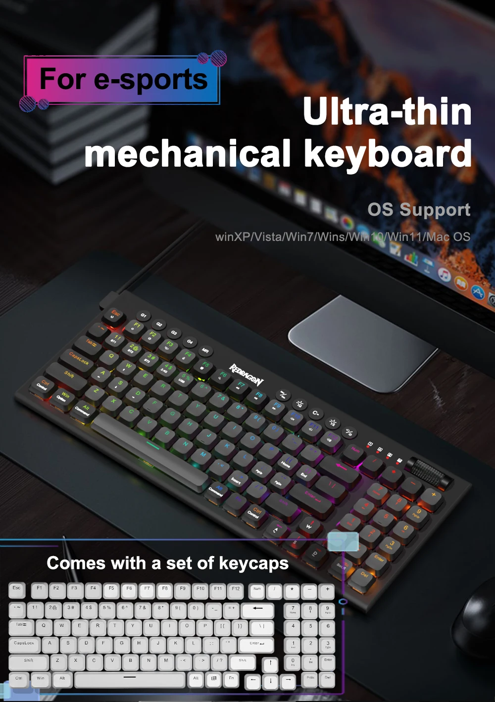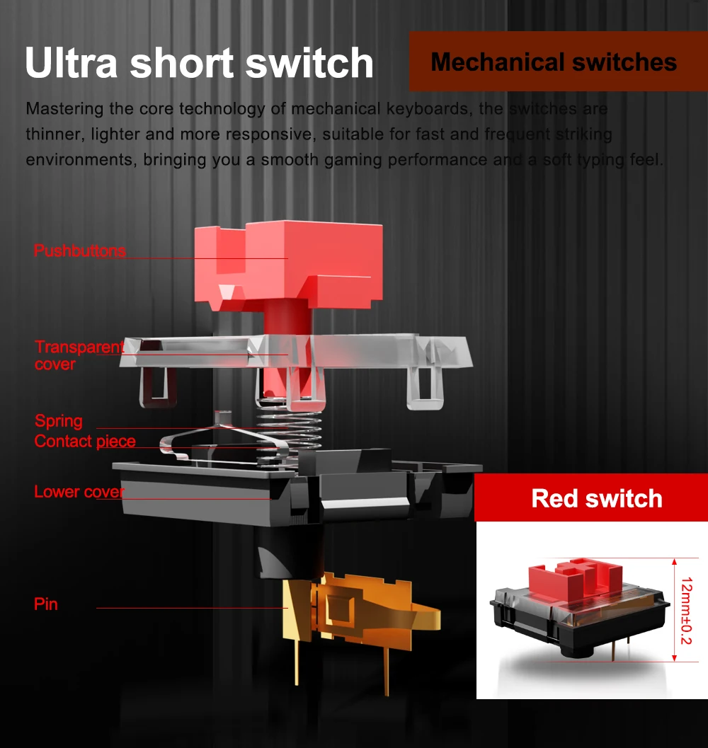 15% Cutted Ultra-Thin: Low profile designed throughout the whole keyboard from the bottom board, middle low-profile RED switches and the top keycaps aim to shorten the distance to actuation as much as possible