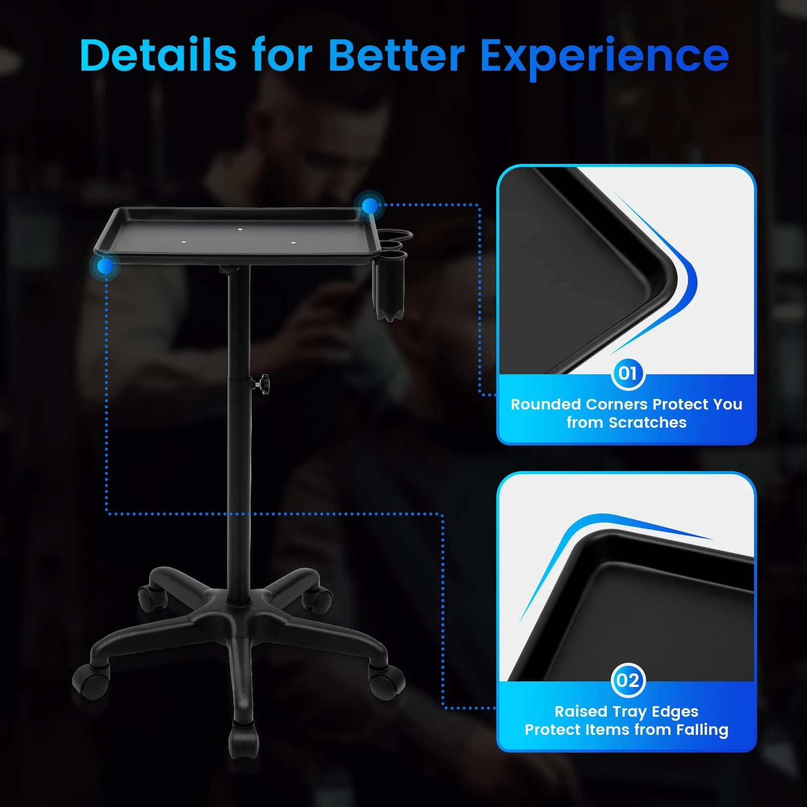 Tool Holder: The side of the tray is equipped with a small tool holder, which is convenient for storing tools such as a hair dryer, electric hair clip, scissors, and combs to enhance the efficiency of the hairdresser.