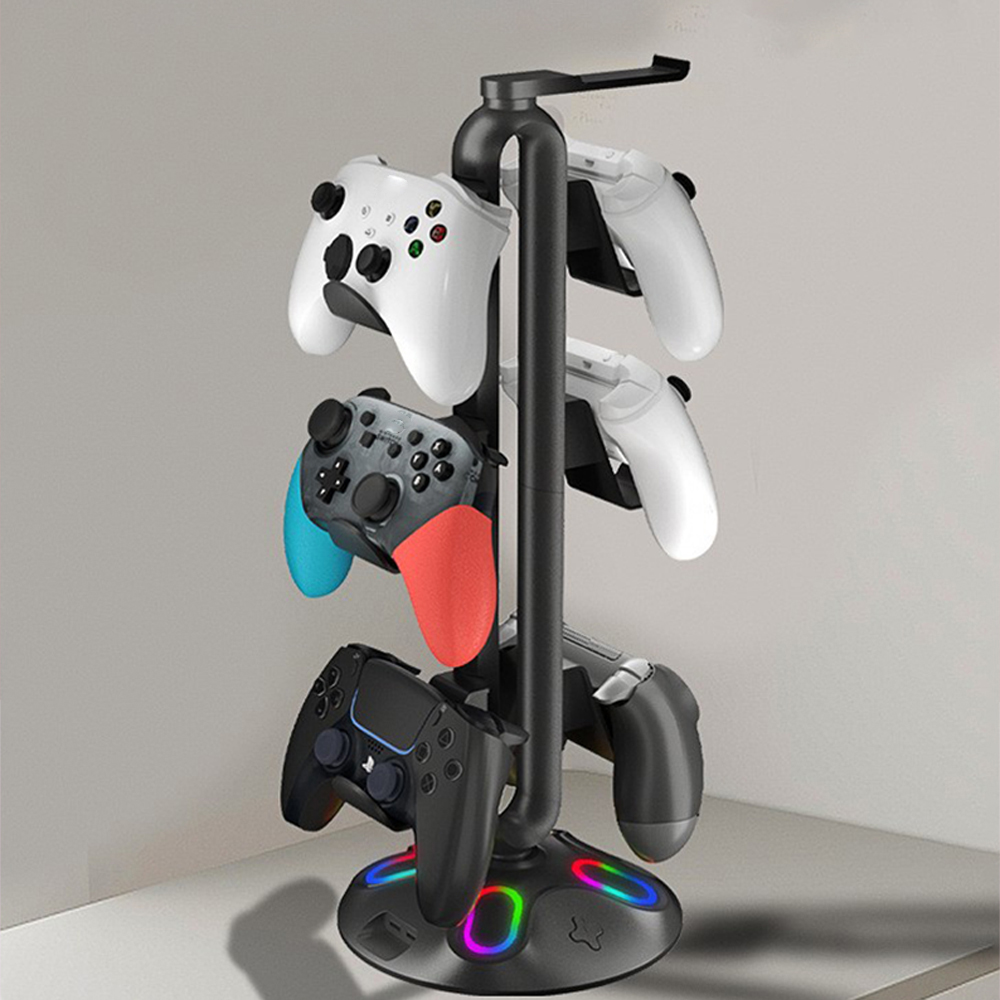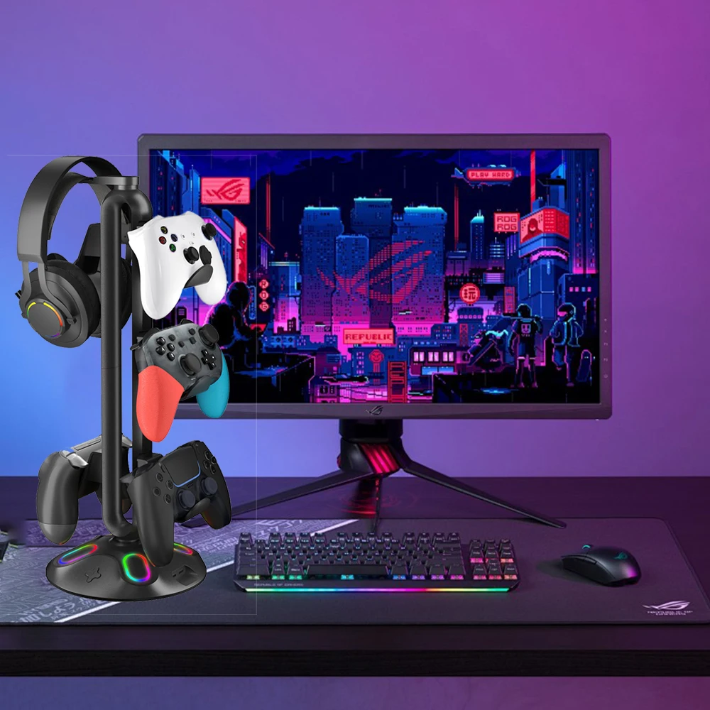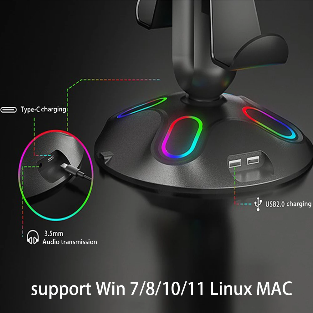 RGB Controller Stand Hanger 9 Light Modes Game Controller Headset Bracket with Hub 2 USB Ports with 3.5mm & Type-C for Home Desk Specification: