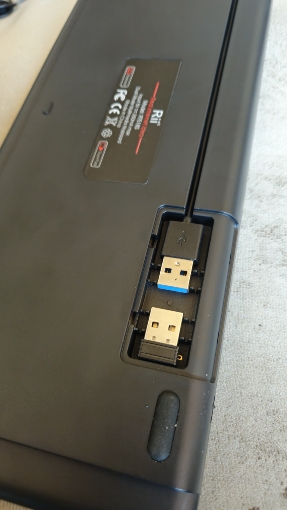 2.4G installation 1.Open the cover ,take out the receiver from the battery compartment . 2.Open the power switch . 3.Insert the USB receiver into the USB port of your device ,the driver will be installed automatically . 4.Press “Mode”key,switch the keyboard to 2.4G mode ,the 2.4G indicator(green) will be ON, then you can use the keyboard .