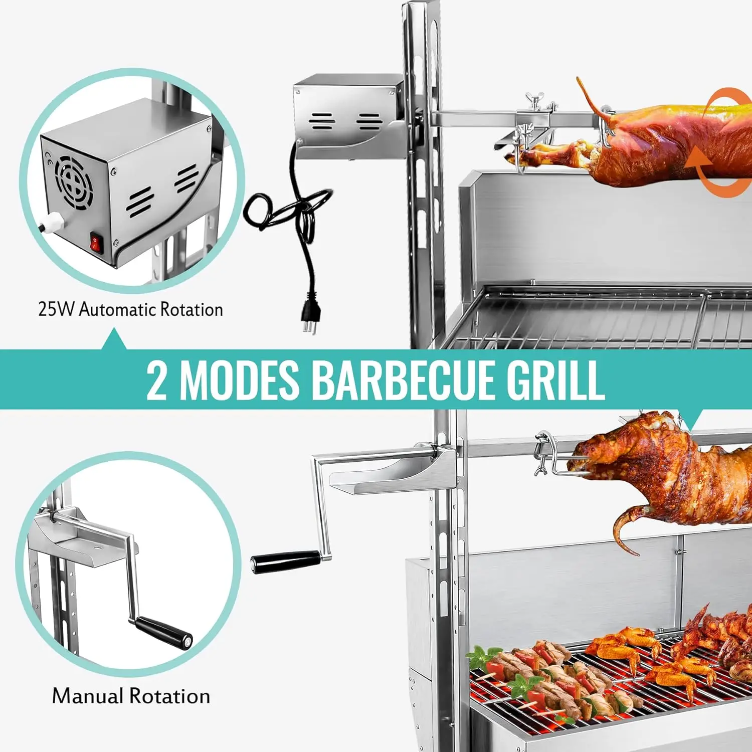 - đă2 in 1 BBQ Rotisserie GrillăYou can choose two ways to rotate the barbecue spit. The first is to use your handle to turn, and the other is to install 25W upgraded electric motor to roast the whole lamb automatically. It has four-level height adjustments to control temperature. Multi-vents on the both sides can help charcoal burn well and the ash catch pan can collect and dispose the ashes. Make the barbecue quicker and easier.