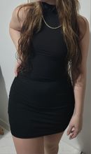 Beautiful dress, equal to the photo! Took only 1 week to arrive. Somewhat elastic channel-Lycra fabric.