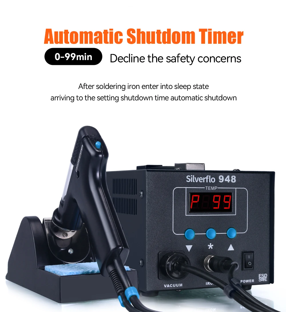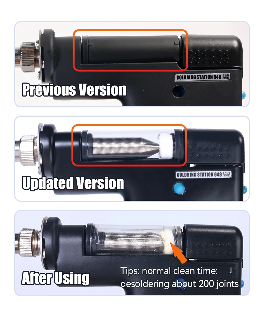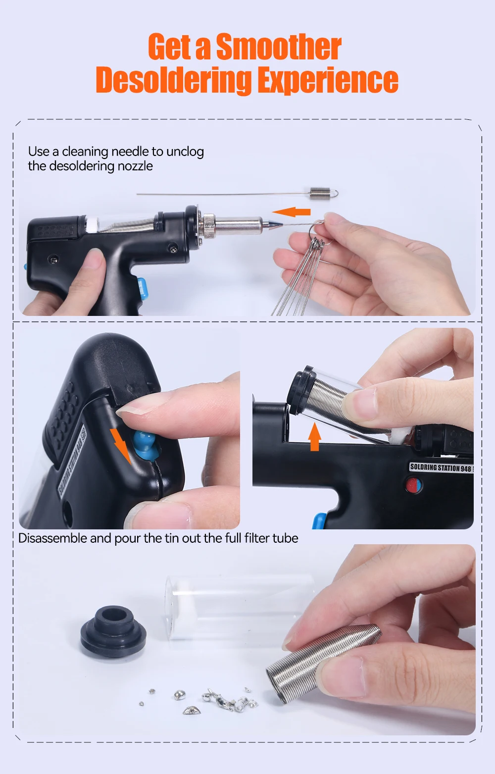 1. Before desoldering: you need to turn the machine on, and the tin gun handle heats up to dissolve the tin of tip and then can suck to desolder