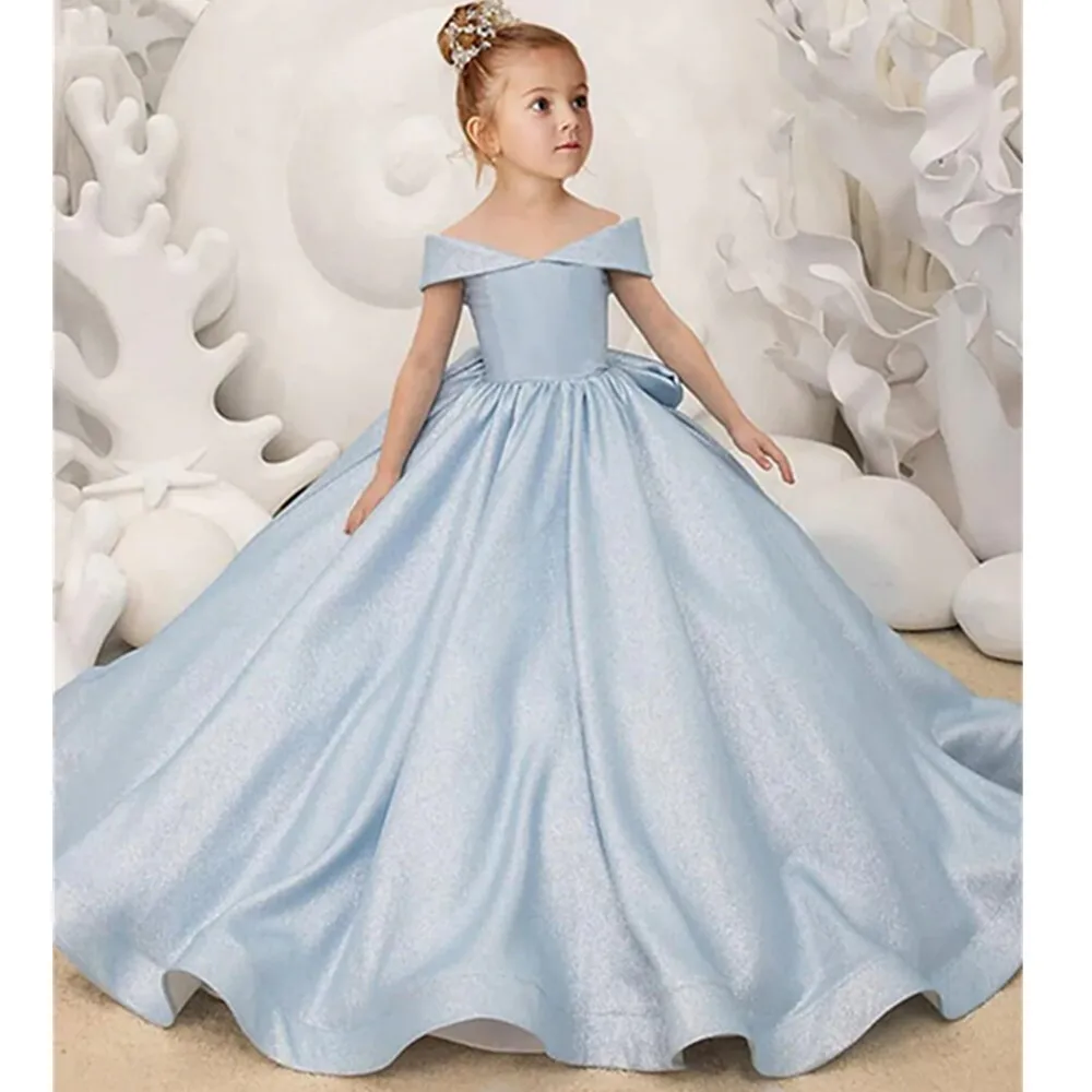 Sky Blue Flower Girl Dress for Wedding Party Off Shoulder Girls Pageant Ball Gowns Floor Length Birthday Party Dress Long