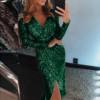 Slim Night Club Party Dress Women Sexy Deep V Sequins Wrap Hip Ruched Long Sleeve Formal Dress Nightclub Performance Costume