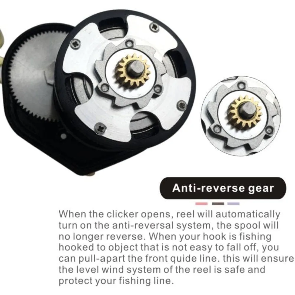 - Anti-reverse gear – When the clicker opens, reel will automatically turn on the anti-reversal system, the spool will no longer reverse. When your hook is fishing hooked to object that is not easy to fall off, you can pull-apart the front quide line. this will ensure the level wind system of the reel is safe and protect your fishing line