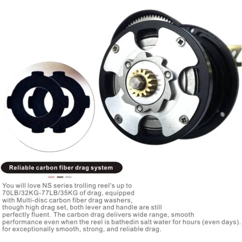 - Reliable carbon fiber drag – You will love JM-T series trolling reel’s up to 77LB/35KG of drag, equipped with Multi-disc carbon fiber drag washers, though high drag set, both lever and handle are still perfectly fluent. The carbon drag delivers wide range, smooth performance even when the reel is bathed in salt water for hours (even days). for exceptionally smooth, strong, and reliable drag