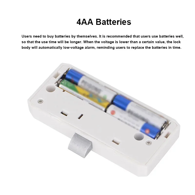 4.Users need to buy batteries by themselves. It is recommended that users use batteries well, so that the use time will be longer. When the voltage is lower than a certain value, the lock body will automatically low-voltage alarm, reminding users to replace the batteries in time.