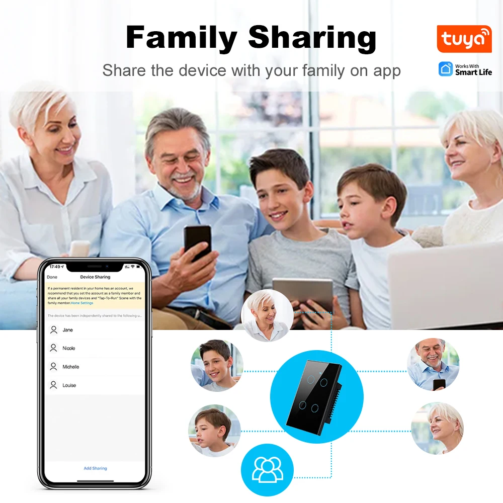 Control One-tap to share the smart Switch with your family member by app to eliminate extra setup processes.