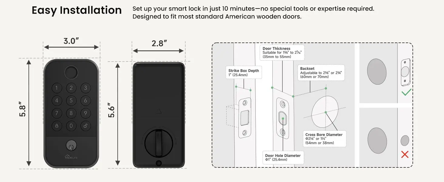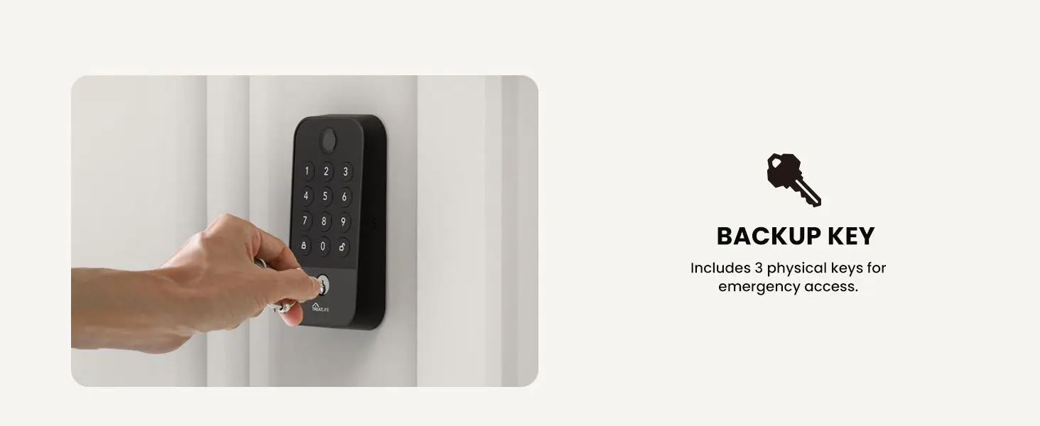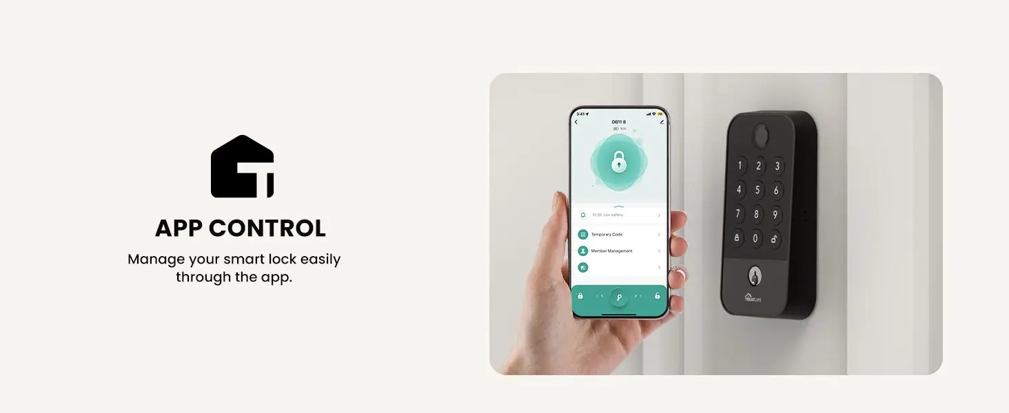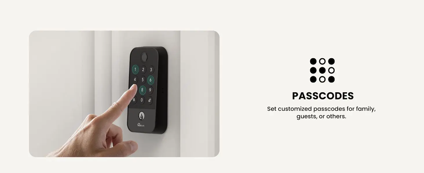 5 Smart Unlocking Methods: Unlock via fingerprint, app passcode (gateway required), mechanical key, offline one-time code, or temporary guest code. Manage up to 100 fingerprints/codes in the Treatlife App. Virtual password prevents peeking, and the lock supports over 100,000 operations.