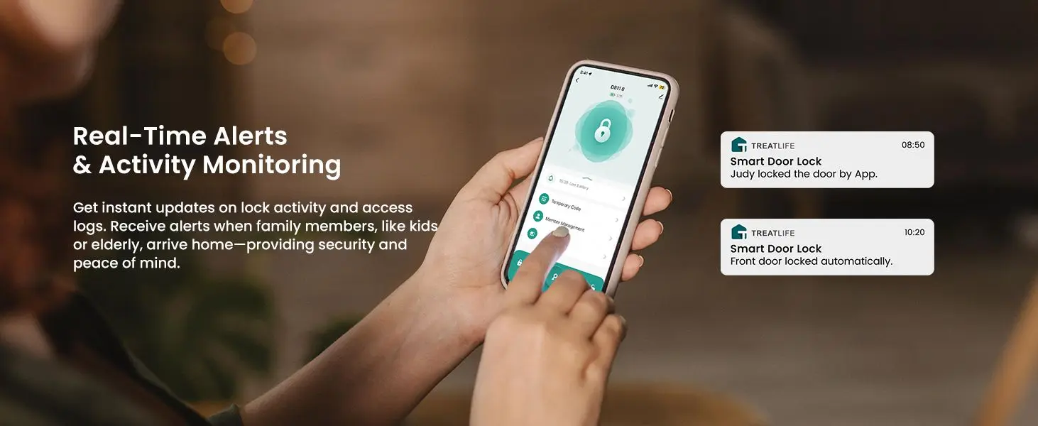 App Control & Real-Time Alerts: Control your WiFi door lock anywhere with the Treatlife App. Remotely lock/unlock, view access logs, and get alerts for failed attempts or low battery. Keep track of family arrivals and enjoy secure, convenient home access anytime.
