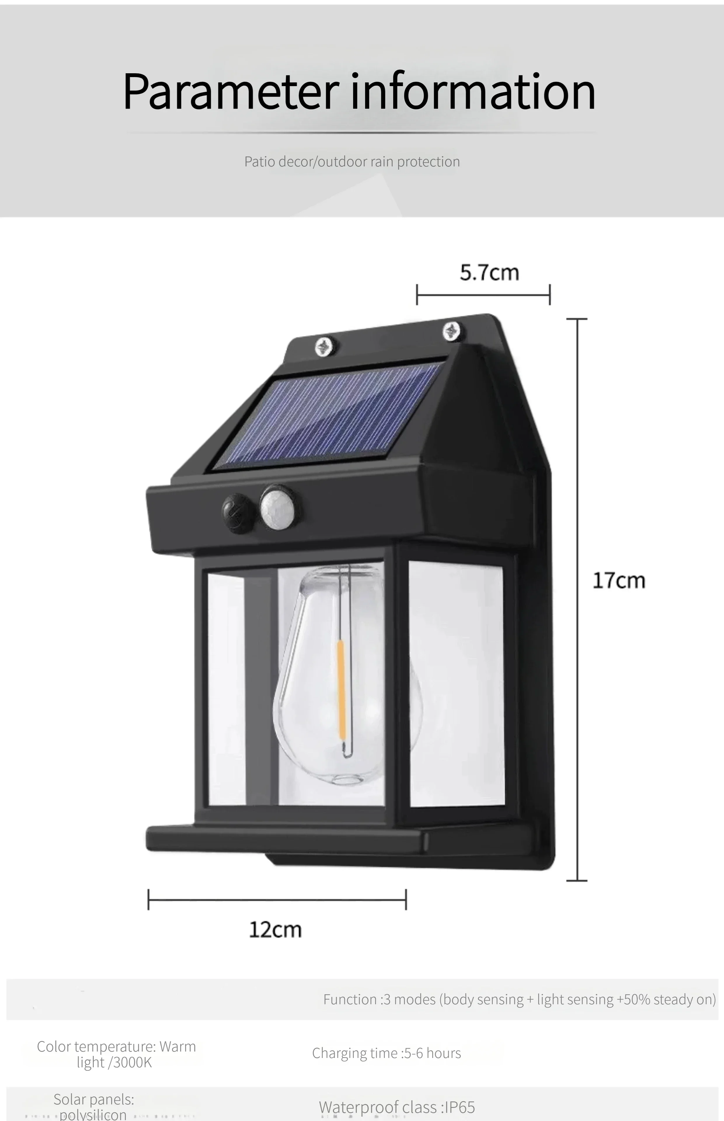 Function :3 modes (body sensing + light sensing +50% steady on)
