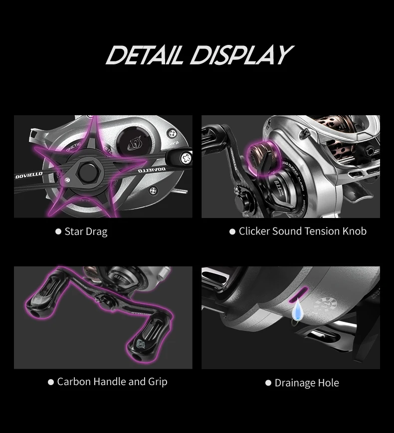 4.Innovative Drag Clicker Sound Kit-Just like many other of our products, we have also installed drag cliker kit in HICC-50′ small body,which is very rare to see on other fishing reel brands, the kit makes baitcasting reel automatically alarm”dadada”sound when fish bite the lure, help you detect every fish nibble signal no matter how small signal is,decrease the chance of loss fish