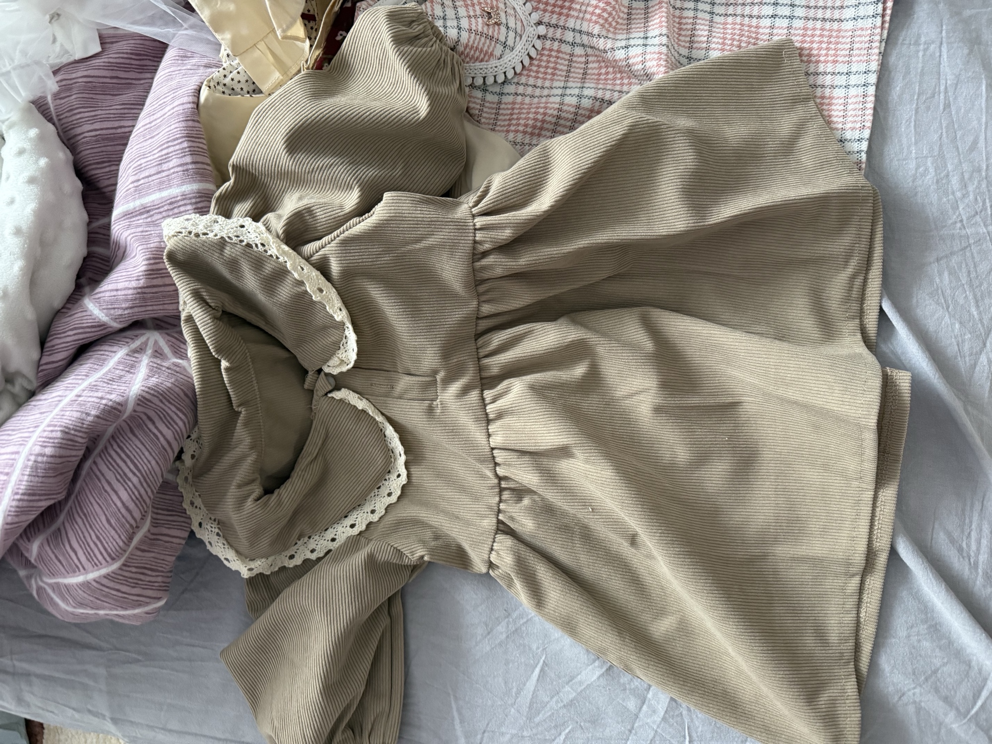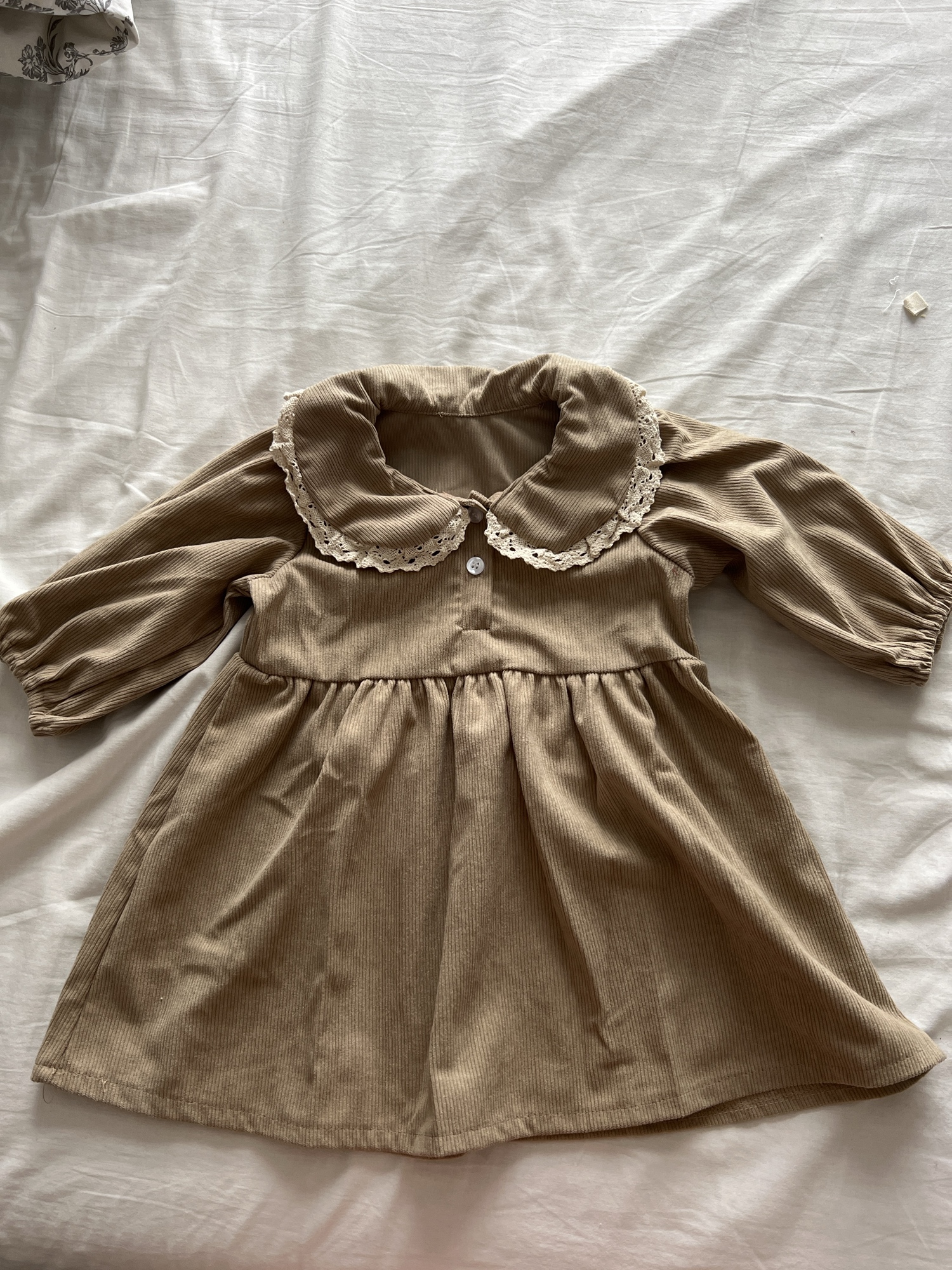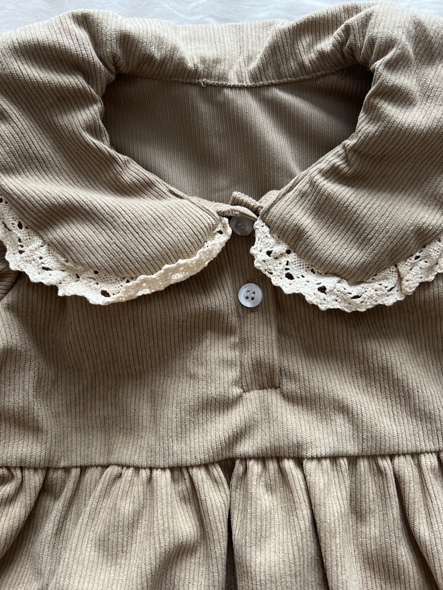 Good corduroy dress. The seller's photo has a cooler shade. Is actually more of a creamy shade.