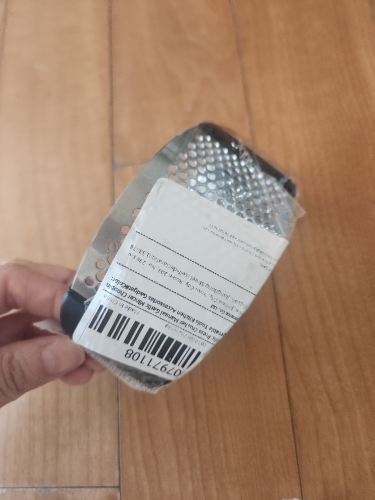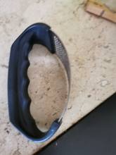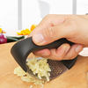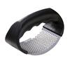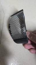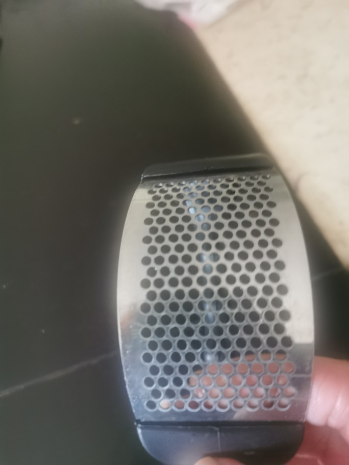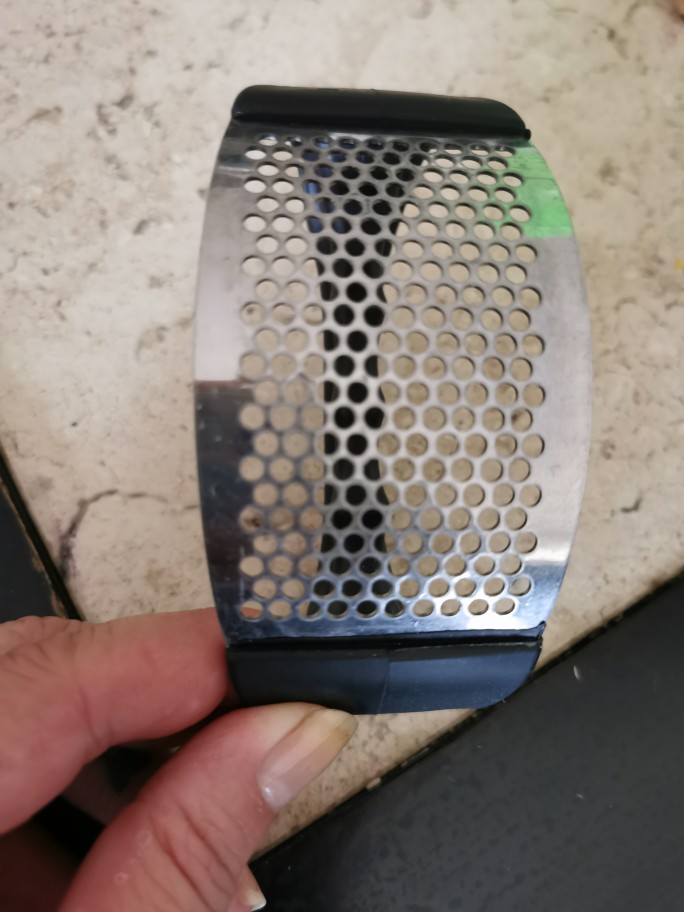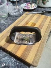 It's big. Works very well. It is made of sheet and hard plastic. Exelent. Very practical. The garlic grind well