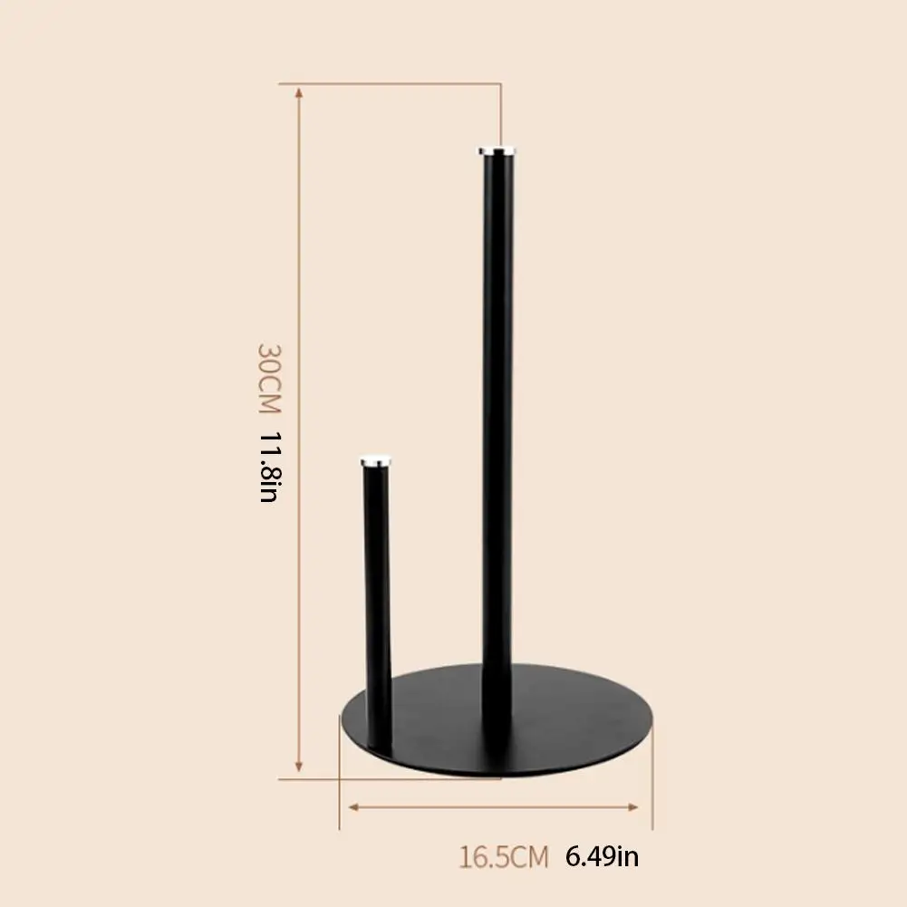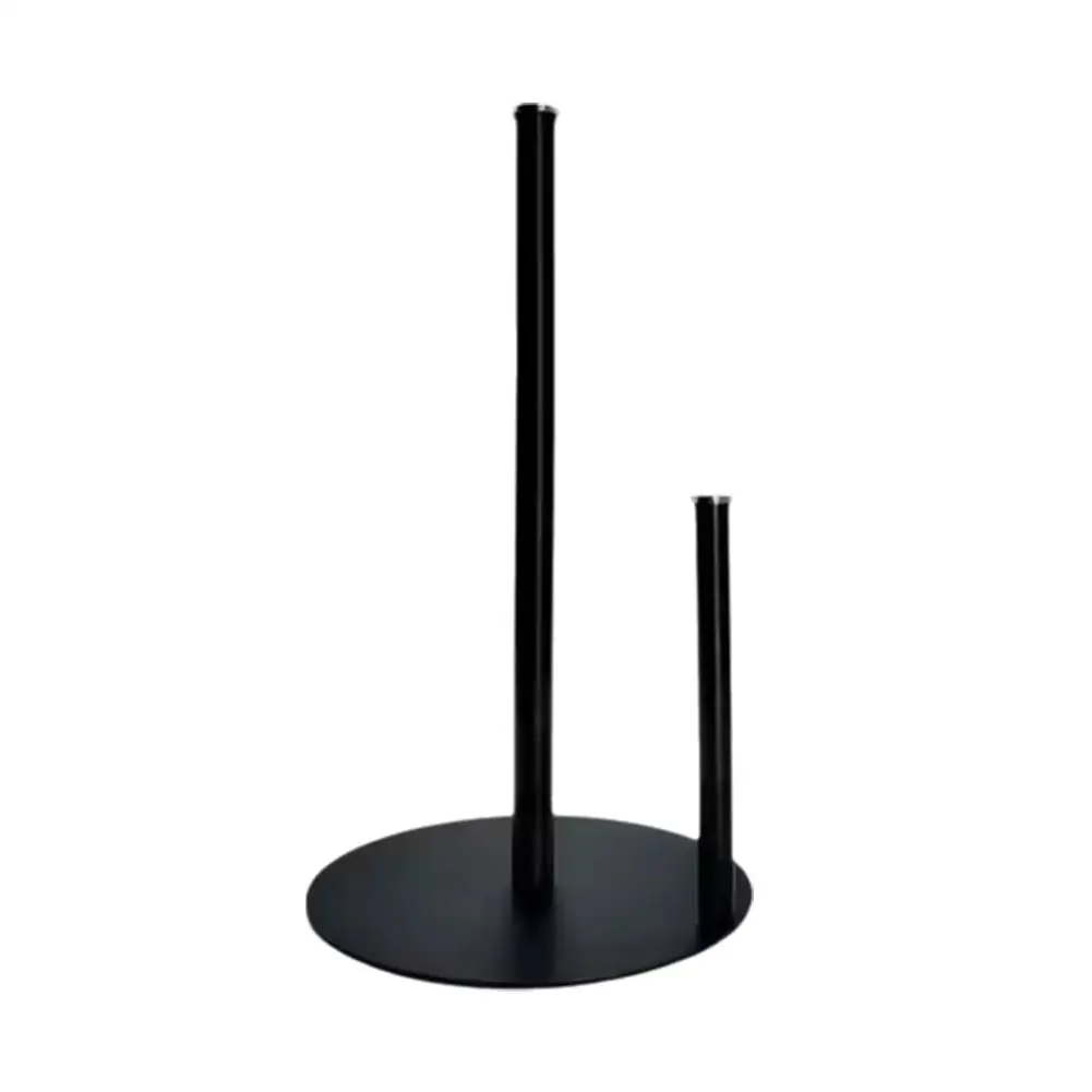 Crafted from high-grade stainless steel and featuring a sleek black finish, this standing paper towel holder combines style with functionality. Its well-proportioned design includes a tall rod measuring 30 cm (11.8″) in height, a shorter auxiliary rod at 15 cm (5.9″), and a stable circular base with a diameter of 16.5 cm (6.5″). Each robust upright rod has a diameter of 4.5 cm (1.77″), topped with a 2 cm (0.79″) cap, providing a substantial feel and appearance.