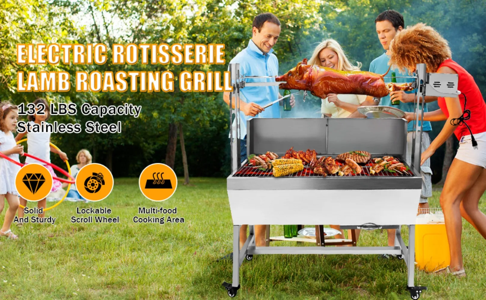 - 🐏【2 in 1 BBQ Rotisserie Grill】The 25W upgraded electric motor is powerful enough to roast the whole lamb automatically.you can roast the whole sheep on the upper layer and self-help barbecue in the net cooking area below.It has four -level height adjustments to control temperature. Multi-vents on the both sides can help charcoal burn well and the ash catch pan can collect and dispose the ashes. Make the barbecue quicker and easier.