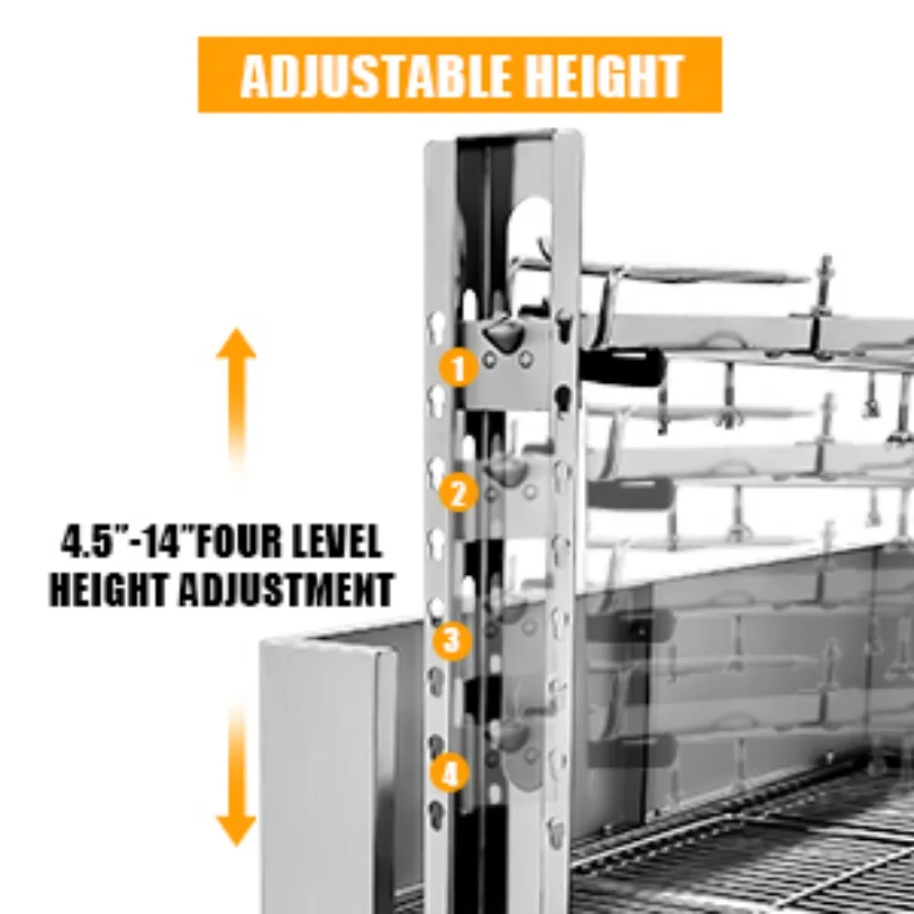 - Adjustable Spit Height: 4.5”-14”/11.5-35.5 cm(Min to Max from Grill Surface)