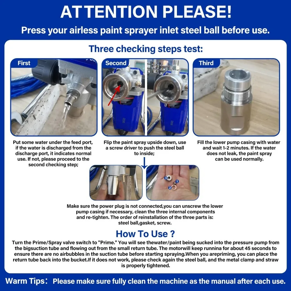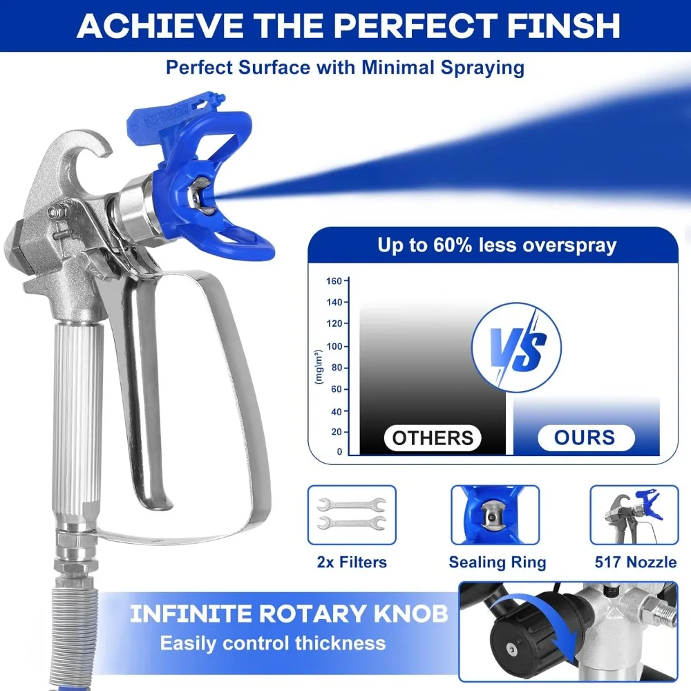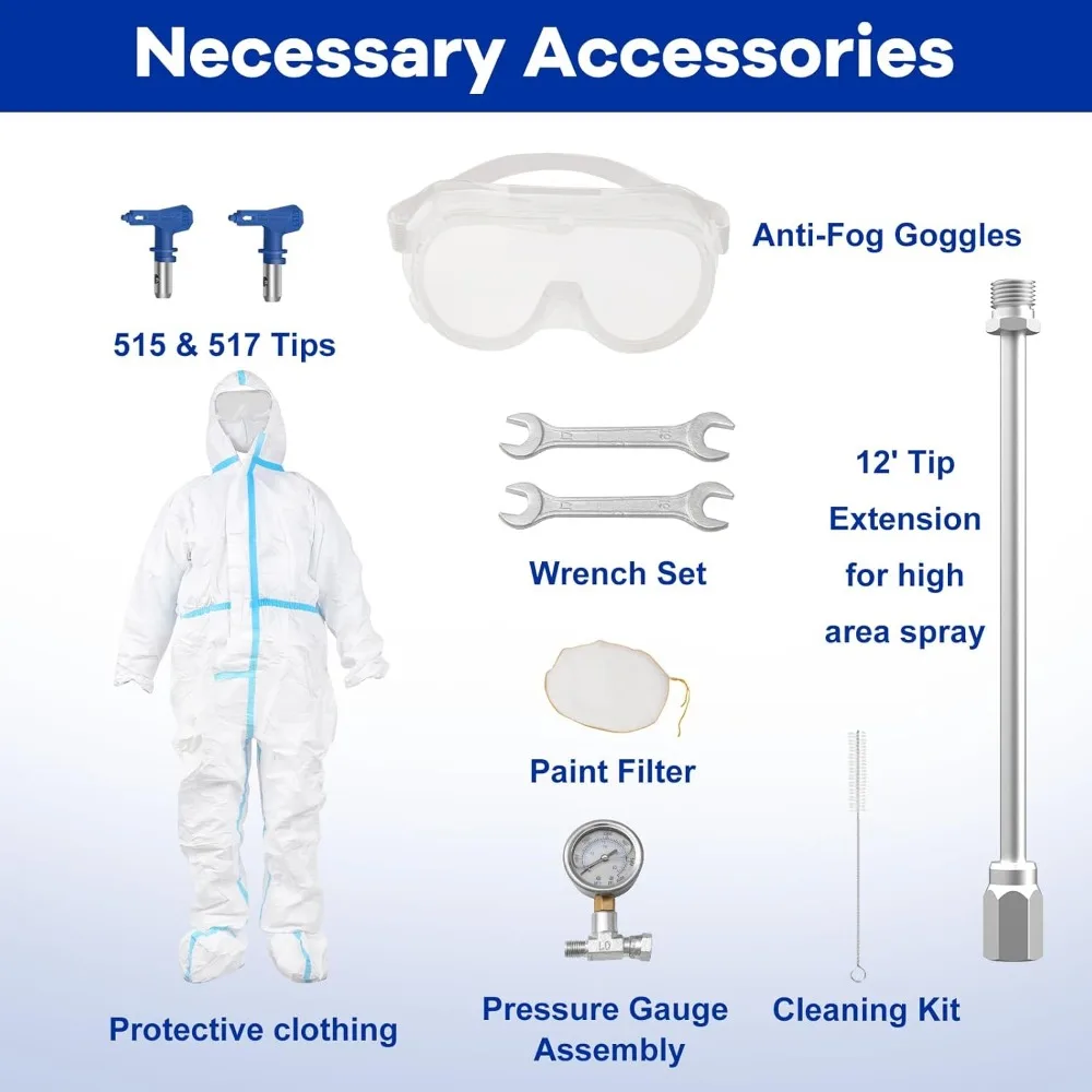 - Perfect Spraying Experience: Comes with a 12-inch tip extension for easy reaching of high areas. Protect your eyes and body from atomized paint with protective clothing, masks, and goggles. The included cleaning tool kit allows for quick cleaning of the spray gun. High polymer sealing rings and dedicated wrenches tighten fittings to ensure a leak-free experience.