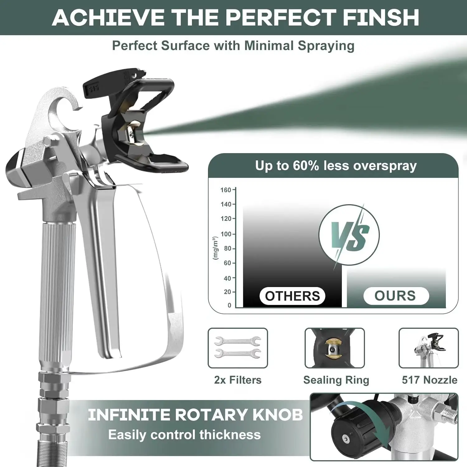 - Perfect Spraying Experience: Comes with a 12-inch tip extension for easy reaching of high areas. Protect your eyes and body from atomized paint with protective clothing, masks, and goggles. The included cleaning tool kit allows for quick cleaning of the spray gun. High polymer sealing rings and dedicated wrenches tighten fittings to ensure a leak-free experience.