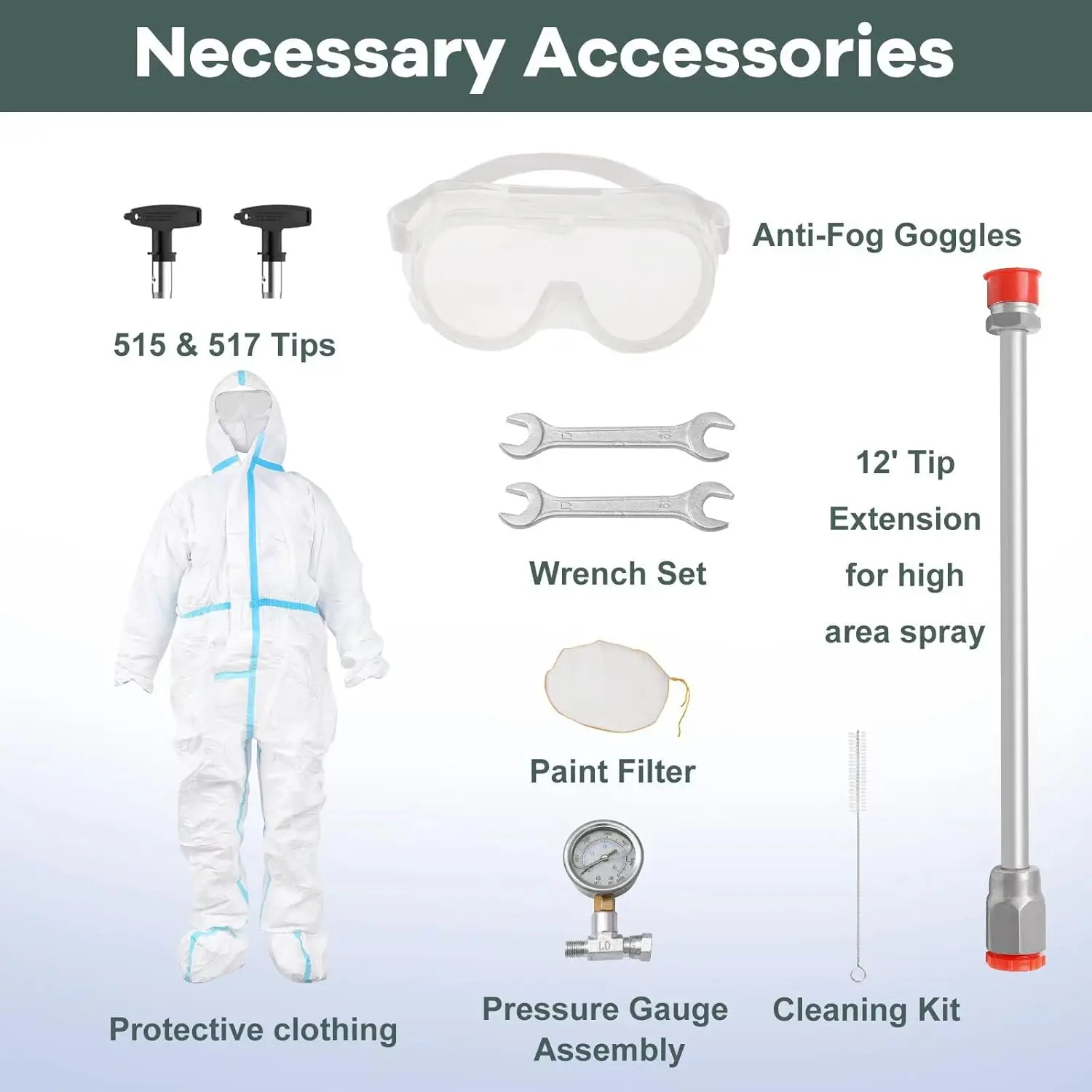- Product Contents: Includes an airless paint sprayer, a spray gun, 515 and 517 nozzles, a 30-foot spray hose assembly, a 12-inch spray extension pole, a pressure gauge, two wrenches, protective clothing, N95 masks, goggles, a cleaning brush, spare sealing rings, and a user manual. The product comes with a 1-year warranty and our technical and after-sales teams are available for any inquiries or assistance through the order.