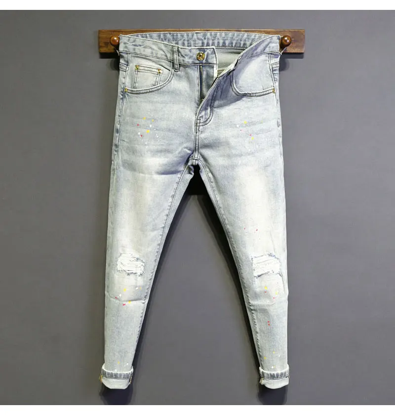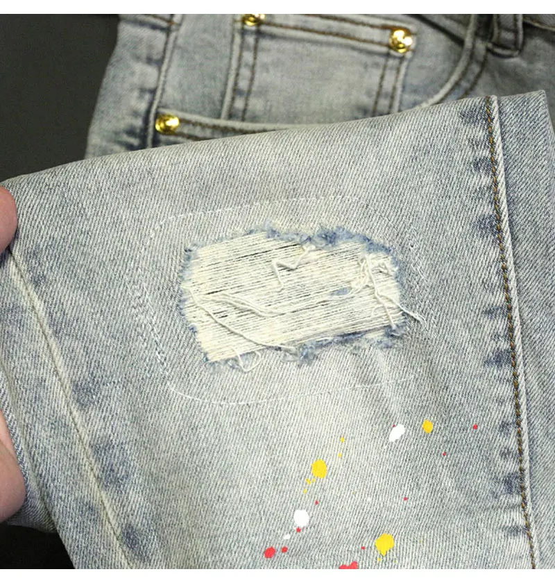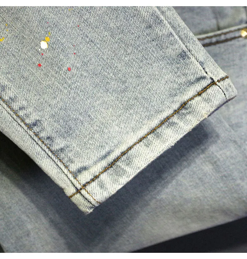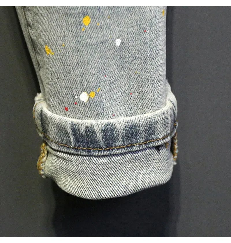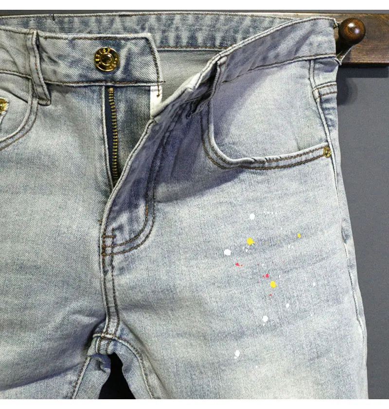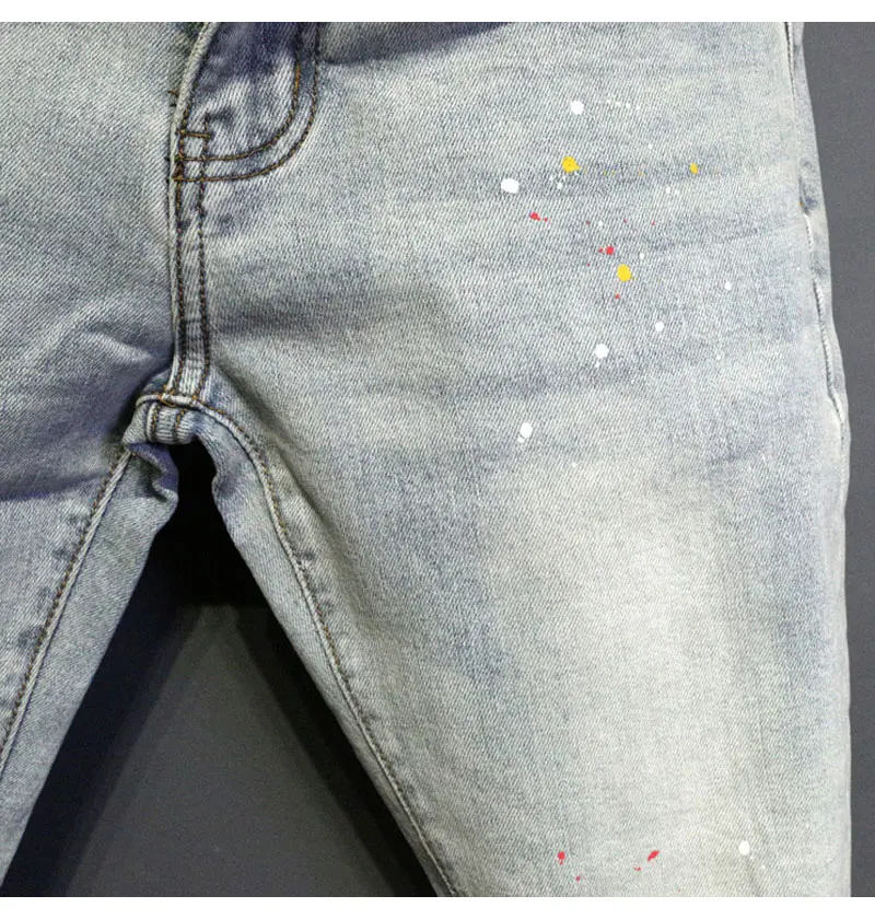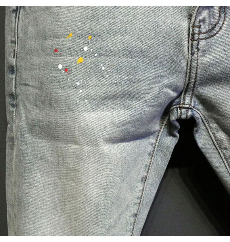 Street fashion men’s jeans elastic tight corrugated jeans men’s painted designer hip-hop retro casual light blue denim pants