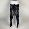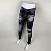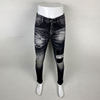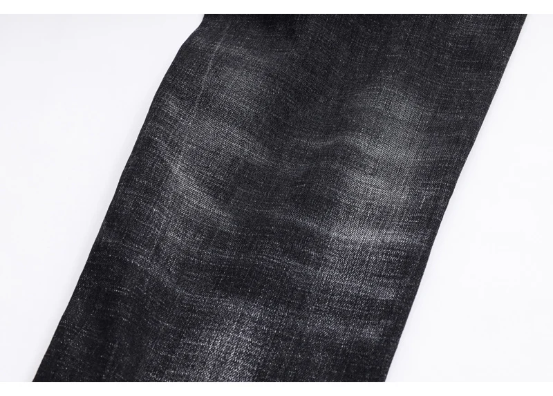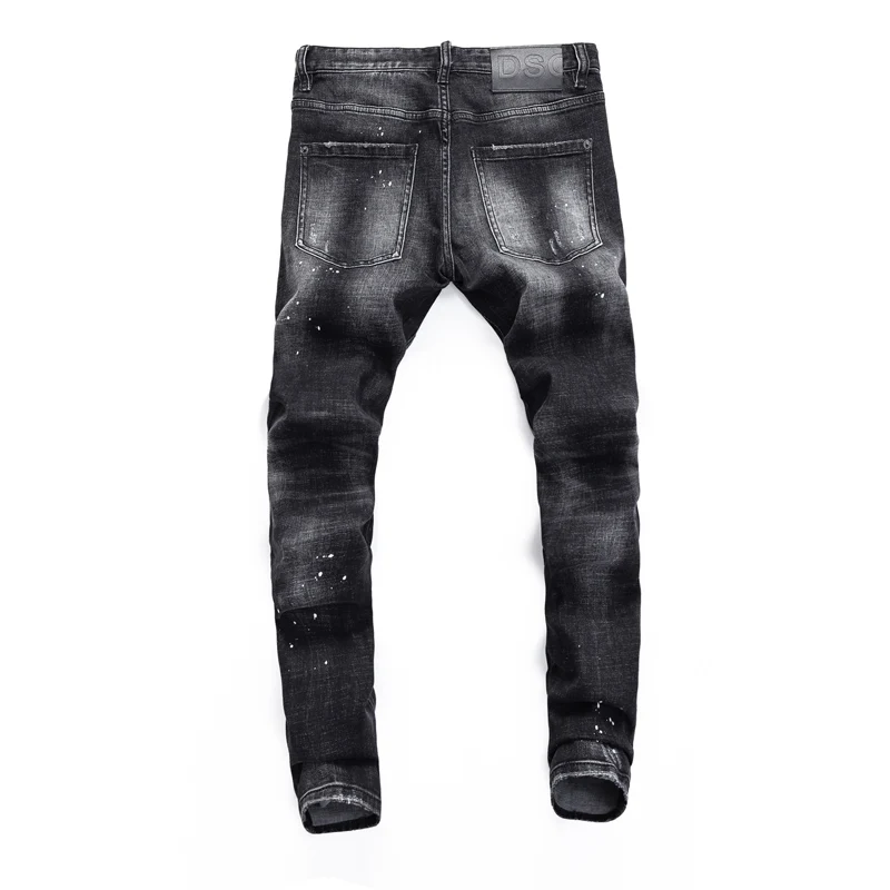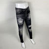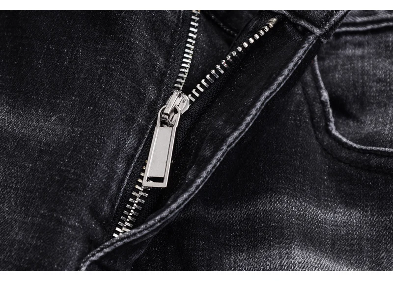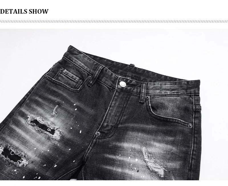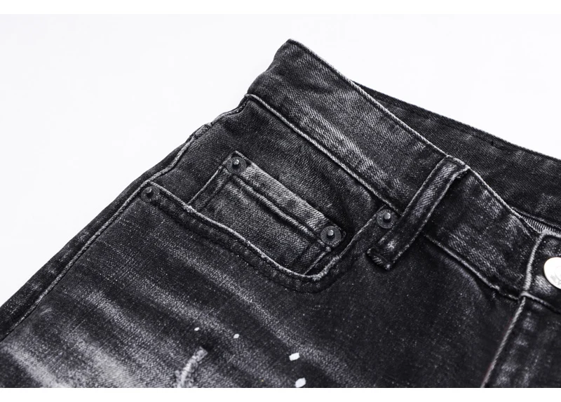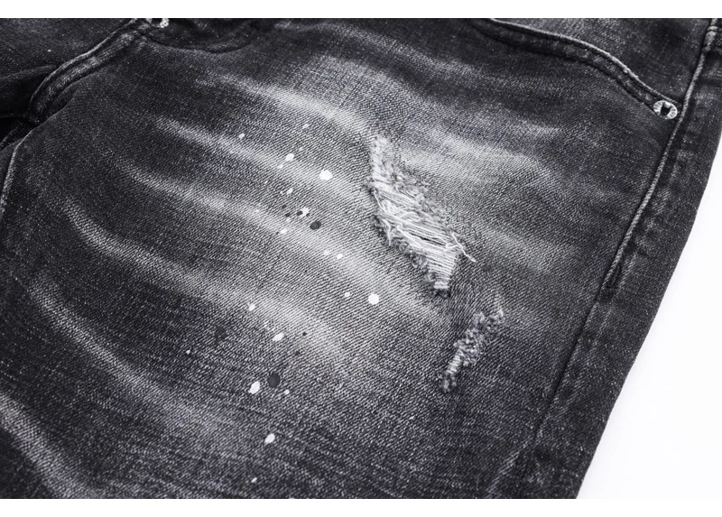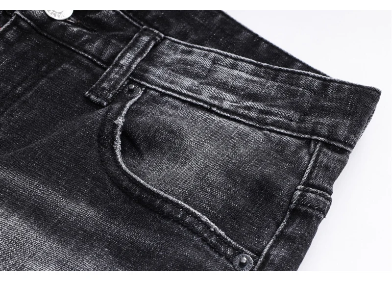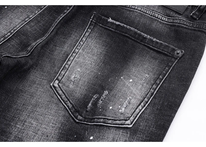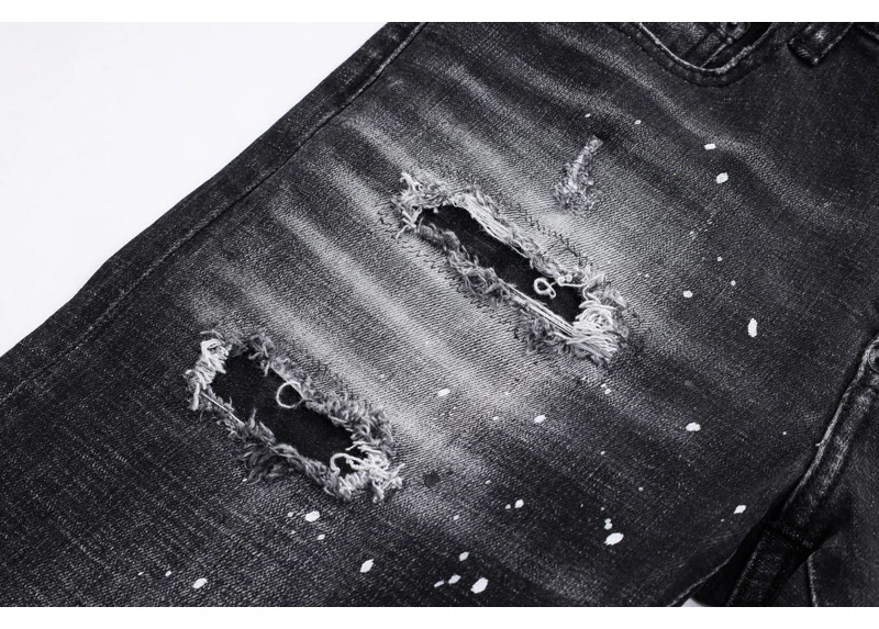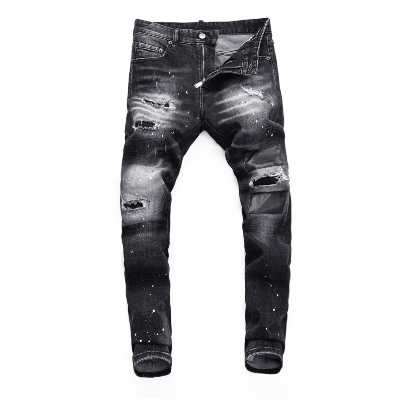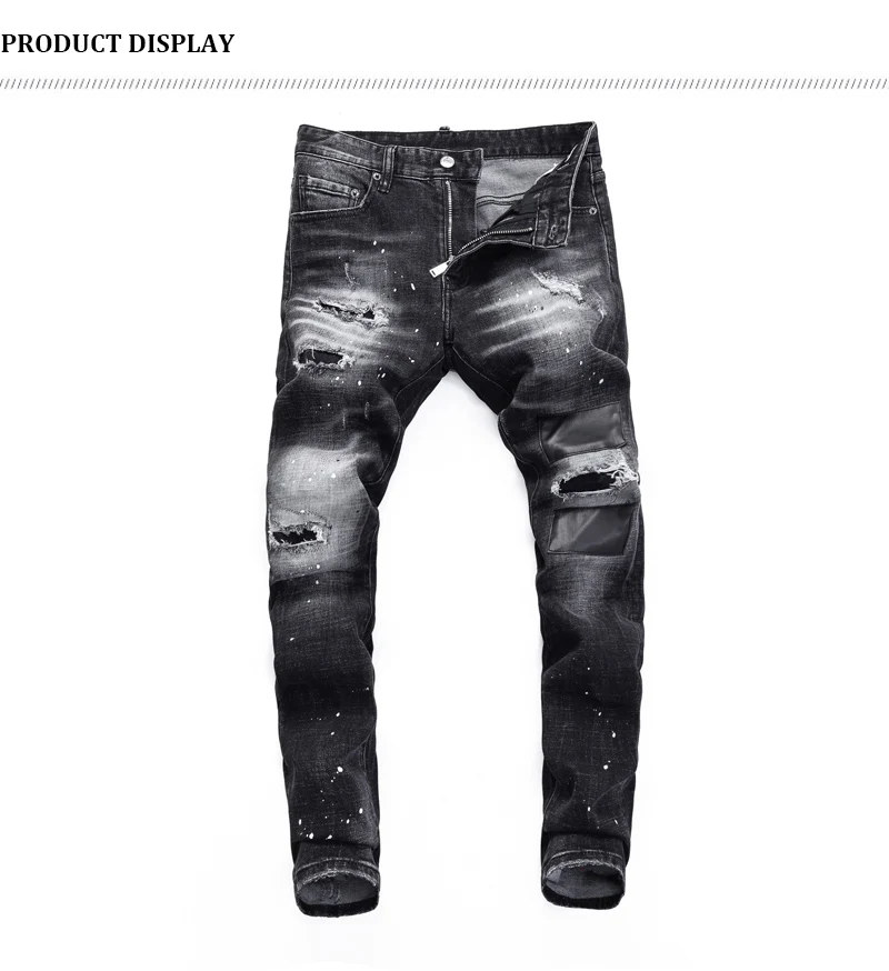 Street fashion men’s jeans retro elastic tight tear jeans men’s leather splicing designer hip-hop brand black gray pants hombre