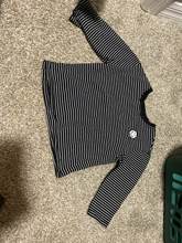 The material is stretch, wide, the sleeve seems to me 3 quarters. Must be measured. I think the size is smaller than on the 100 label.