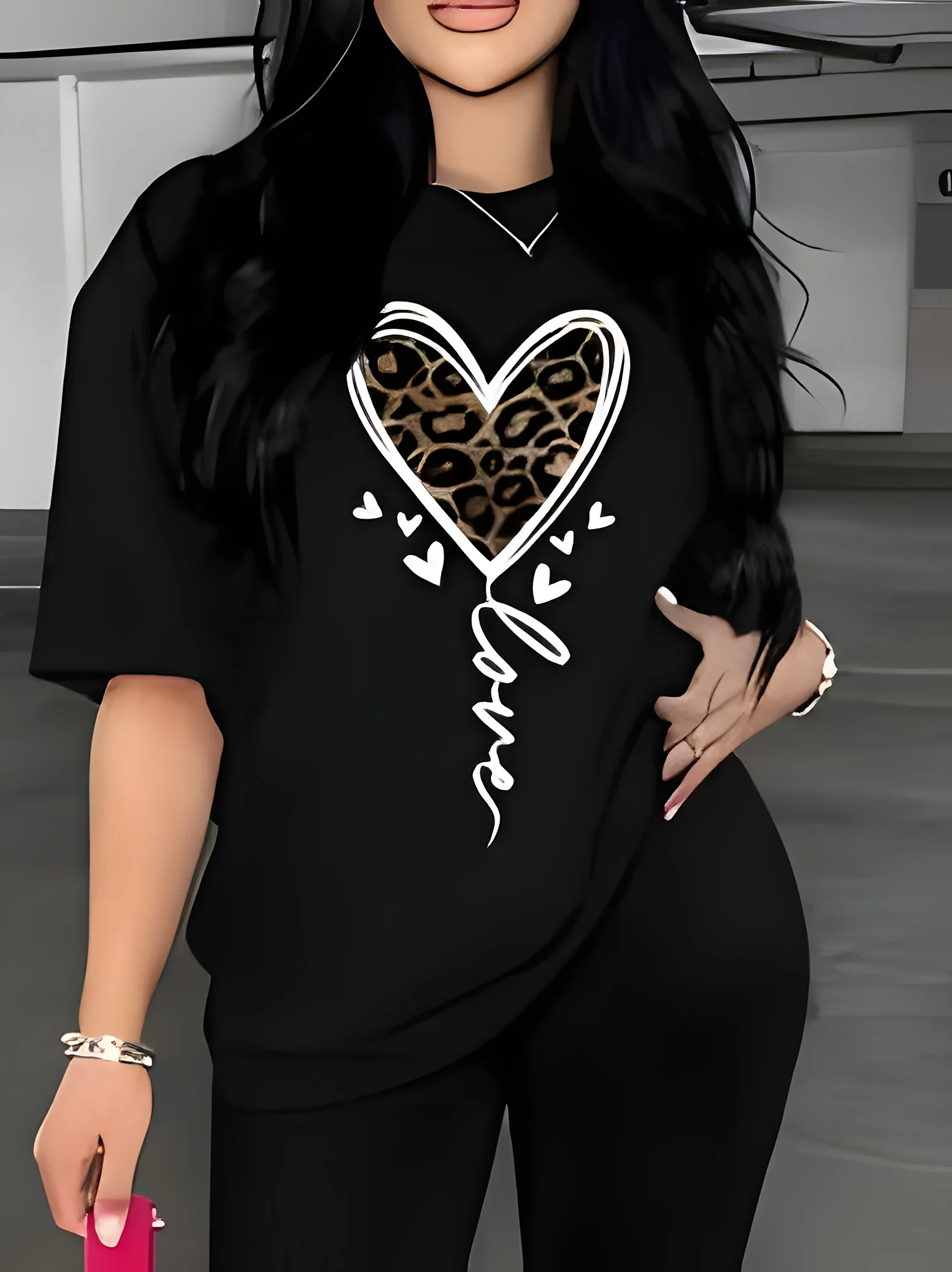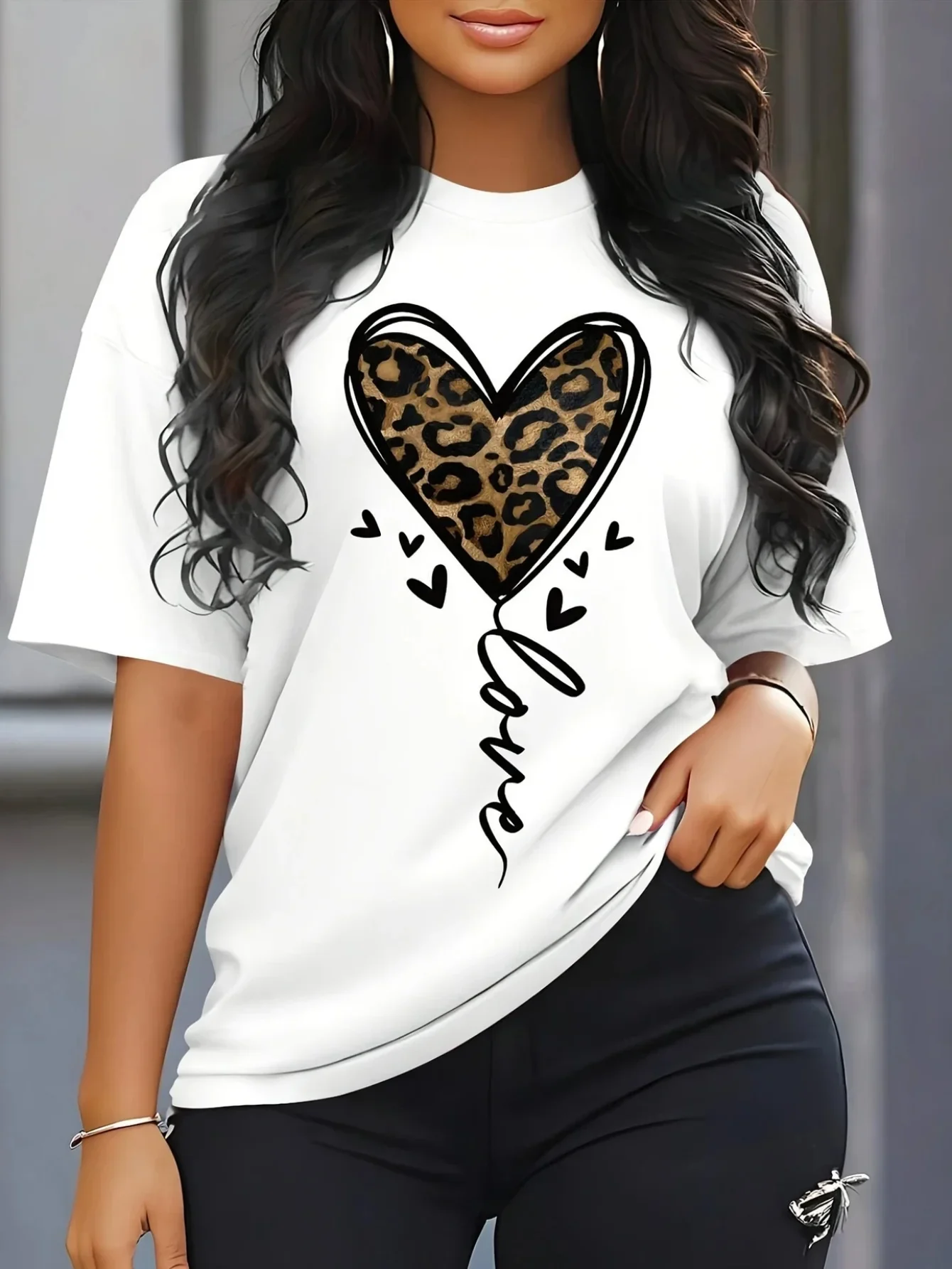 Stylish Round Neck Short Sleeve T Shirt for American Women Leopard Print Heart Mama Design Creative and Chic Breathable