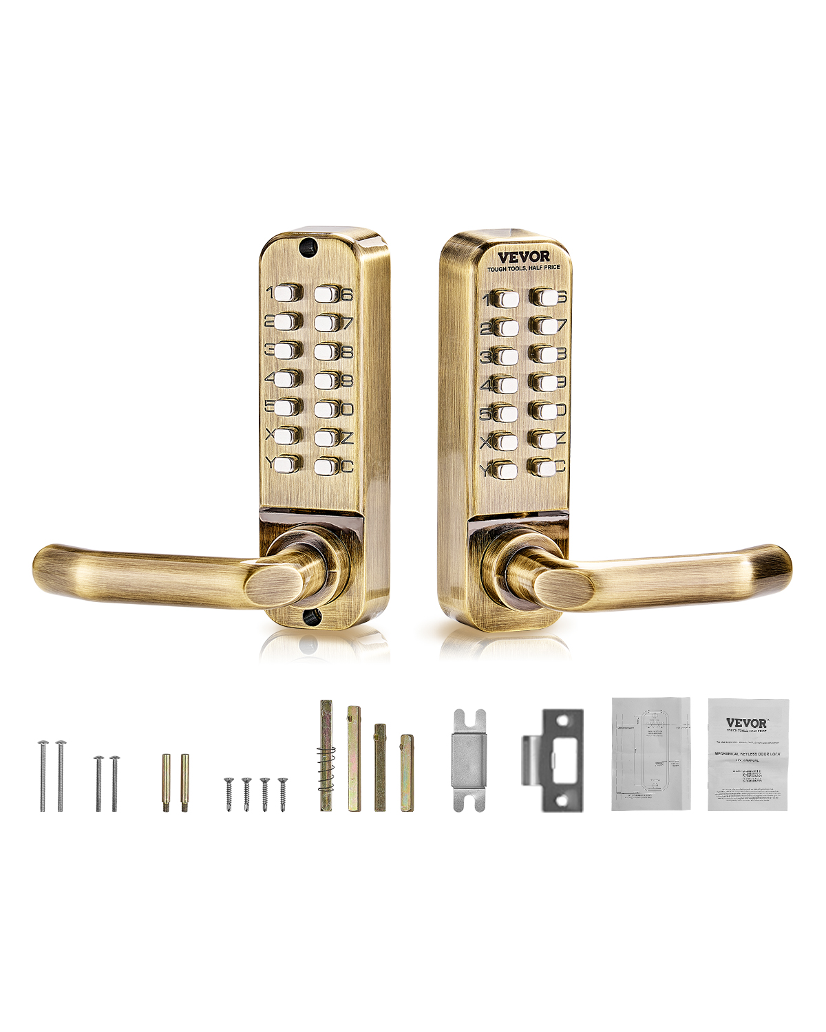 This mechanical keyless entry door lock has a robust, battery-free design. The latch bolt is made of durable zinc alloy, waterproof, and rust-resistant. It comes with screws and bolts for various door sizes and easy installation with provided videos and instructions.