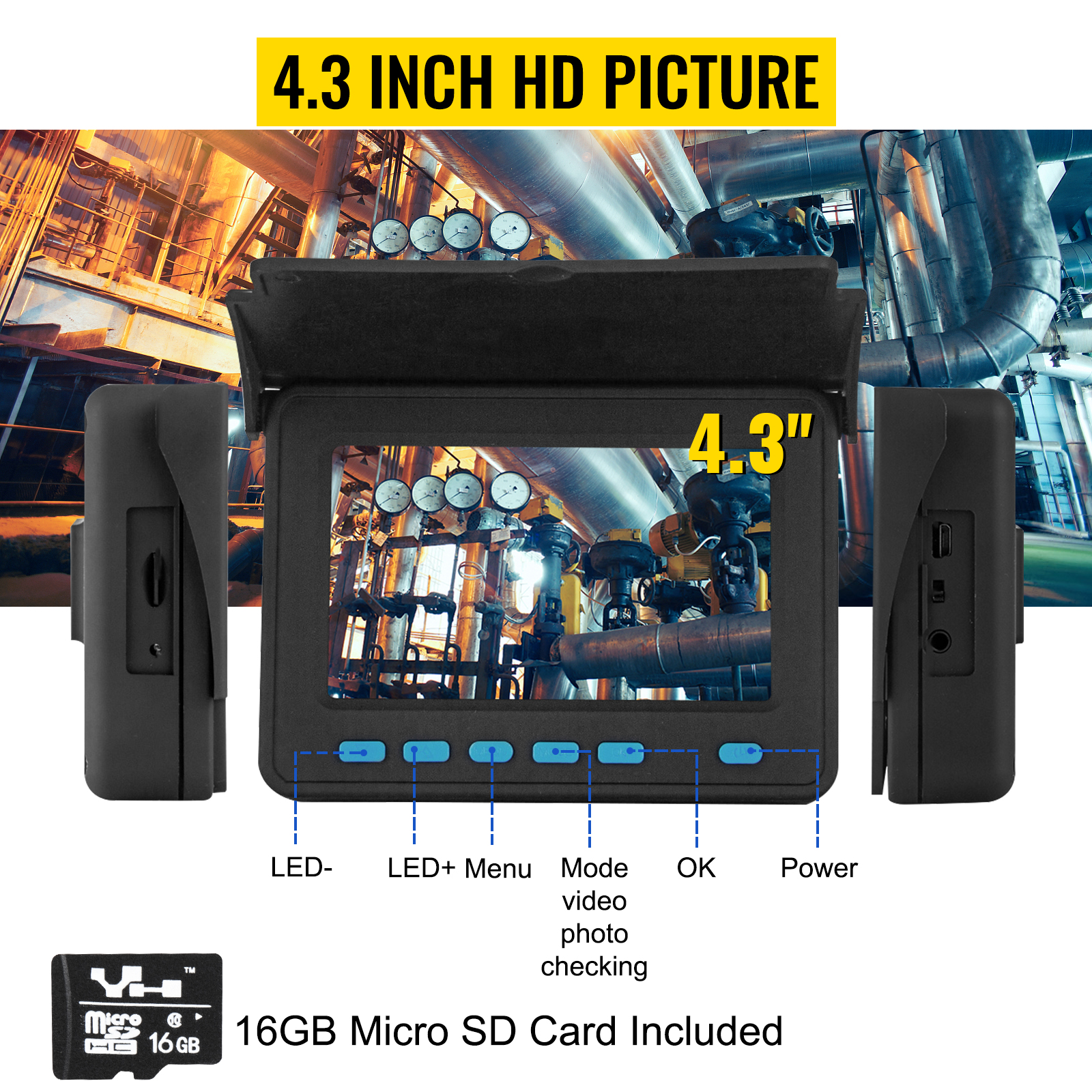 High-Resolution 4.3″ Color LCD Screen: This camera system features a 4.3-inch TFT LCD screen with 1200TVL resolution, delivering clear, vibrant images. The built-in DVR function allows you to record and save inspections to the included 16GB microSD card for easy reference and analysis later.