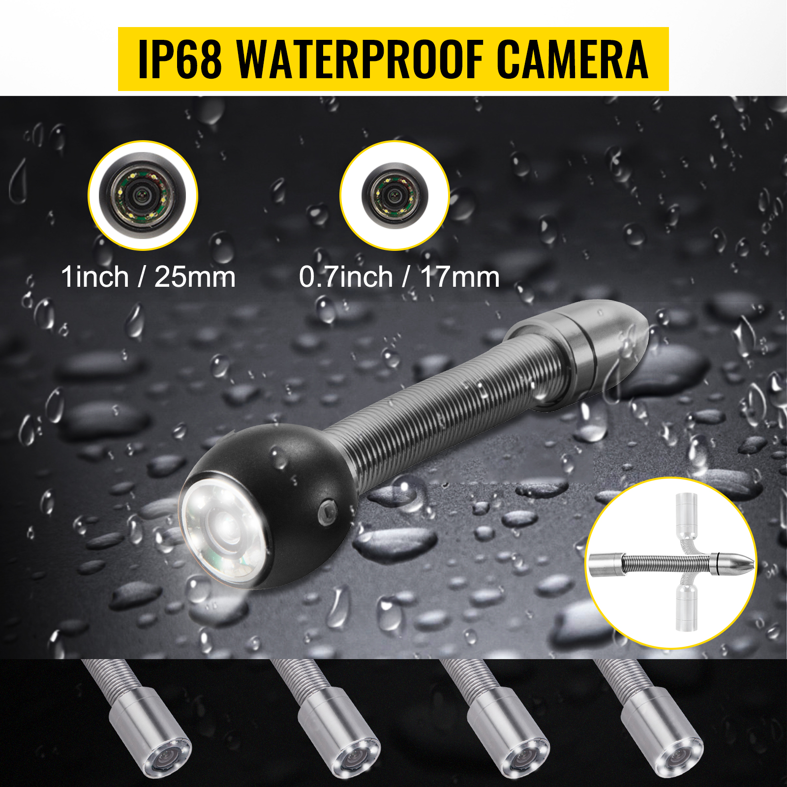 Waterproof and Illuminated Camera: With a 0.7″ (17mm) diameter and IP68 waterproof rating, the camera works perfectly underwater up to 20m. It features 6 adjustable LED lights, ensuring excellent illumination even in dark or low-light spaces, making it ideal for tight or obstructed pipes.